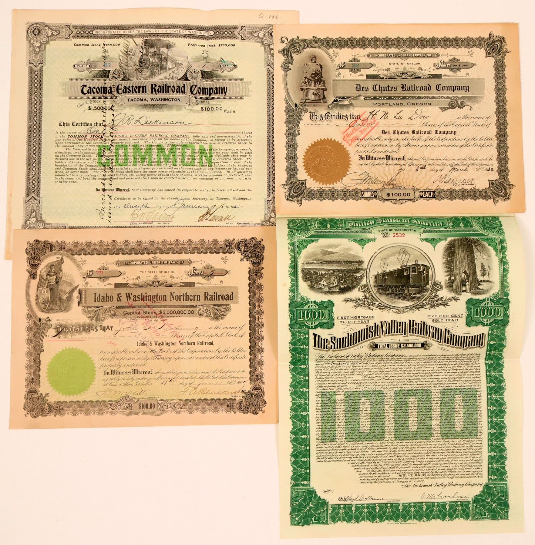 Group of four stock certs issued by The Des ChutesRR Company, Idaho & Washington Northern, The Snohomish Valley Ry and Tacoma Eastern RR Co. There are transfer stamps on two of the certs.