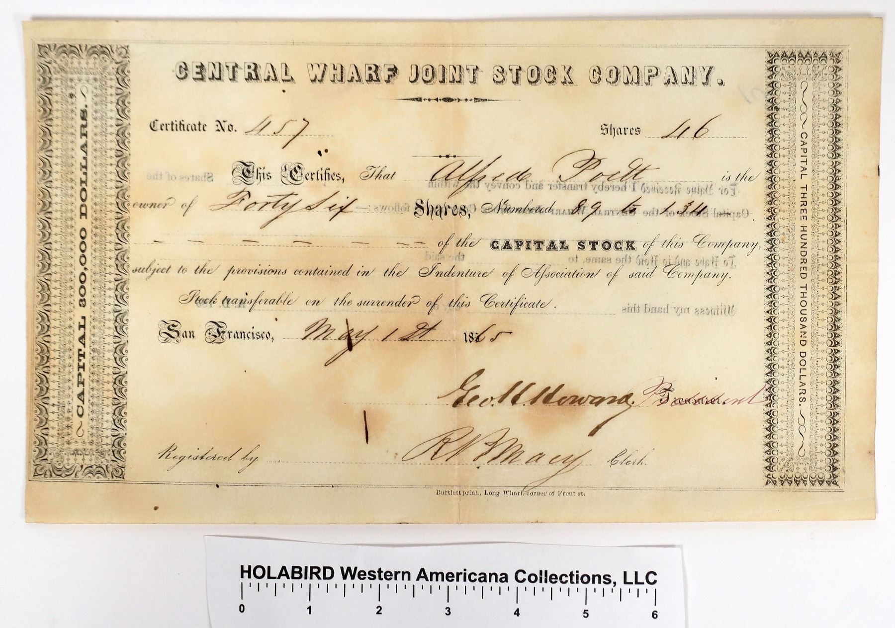 Rare San Francisco Wharf stock tied to the Gold Rush. Certificate No. 457, issued for 46 shares to Alfred Poett on May 1st, 1865 in San Francisco. Signed by president Geo. H. Howard and clerk R. Macy. Not cancelled. Black border and print on very thin paper. Bartlett Print, Long Wharf, Corner of Front St. Pinholes, folds, toning. 5.25 x 9" The Central Wharf Joint Stock Company was formed in April 1849. Their plan was to construct a wharf along Clay, Sacramento, Sansome and Battery Sts. Their proposal was a 36 foot wide, 700 foot long wharf. They raised $100,000 very quickly. The principal shareholders of the company were other merchants including Sam Brannan; Cross, Hobson & Co.; James C. Ward; Joseph L. Folsom; and DeWitt & Harrison. The wharf was completed by the end of 1849 and was immediately profitable, paying a 10% dividend to its shareholders. The success of the Central Wharf fueled the city to fund the construction of other wharves. In the 1860s, there are newspaper articles about litigation against the company, including an injunction from the Harbor Commissioners. [Ref: Gold Rush Port, Delgado; CDNC] San Francisco California 1865