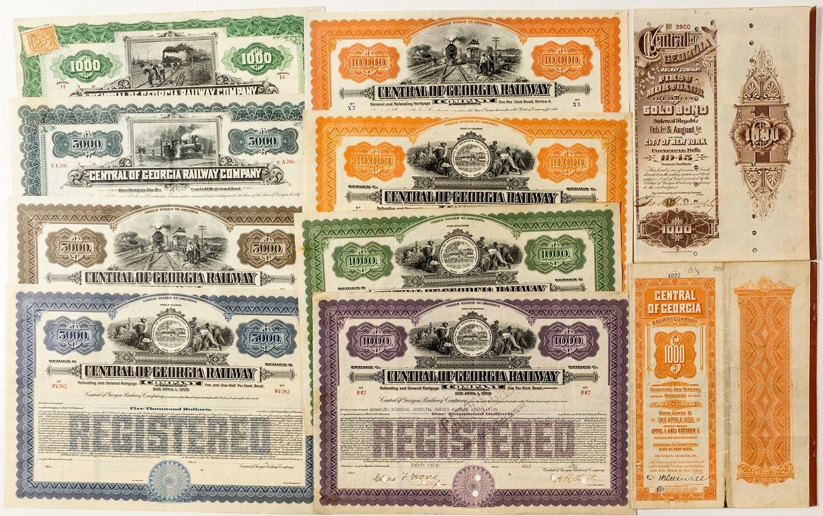 Lot of 10, all different. Includes: two $10,000 bonds with different vignettes, one issued and punch cancelled in 1928, the other unissued; three $5,000 bonds with different vignettes and color borders, two unissued, one issued in 1920 and punch cancelled; and five $1,000 bonds with either different vignettes or colors, including 1895 (with coupons), 1897, 1919 (with coupons), 1930 and 1942, all punch cancelled. (Prag Collection) City: State: Georgia Date: 1895-1942 hwac# 33912