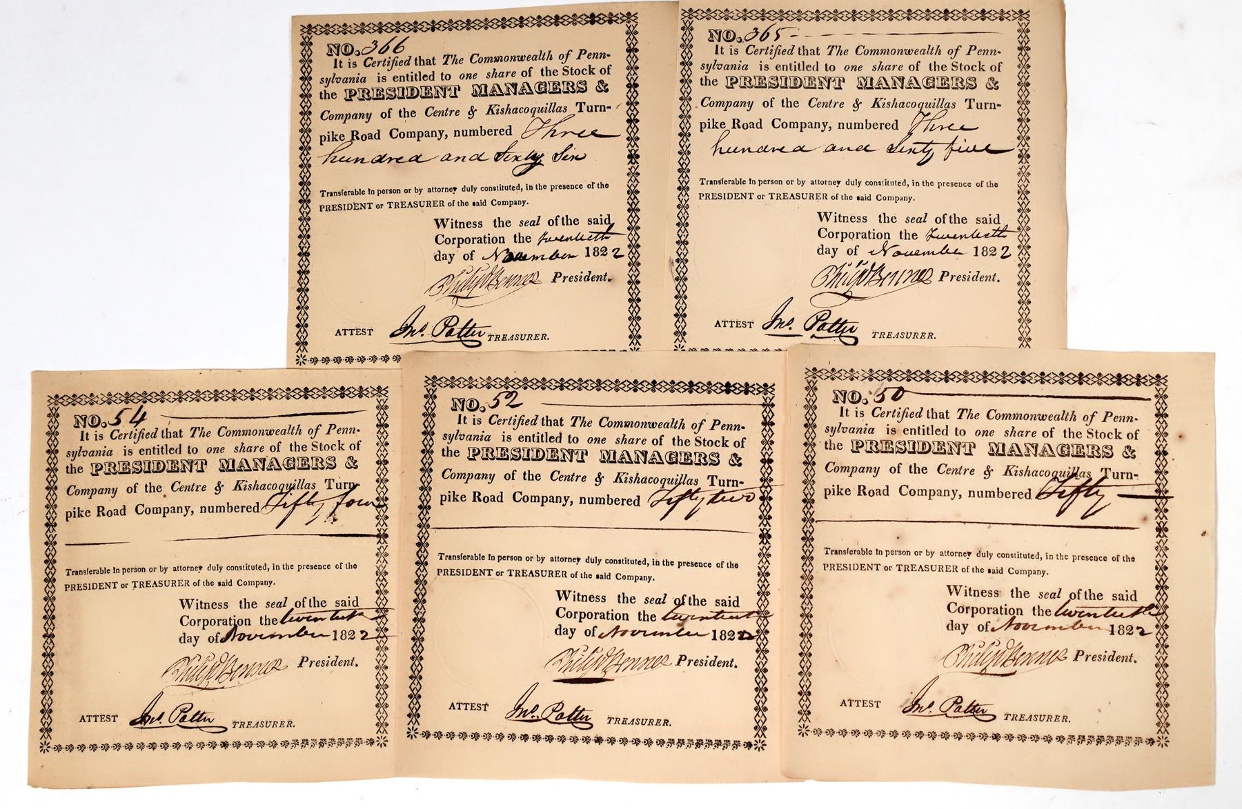 5 Centre & Kishacoquillas Turnpike Road Co. stocks, issued to Commonwealth of Pennsylvania, 1822. Signed by Philip Benner President, an early business leader in Centre County. ? Patter Treasurer.