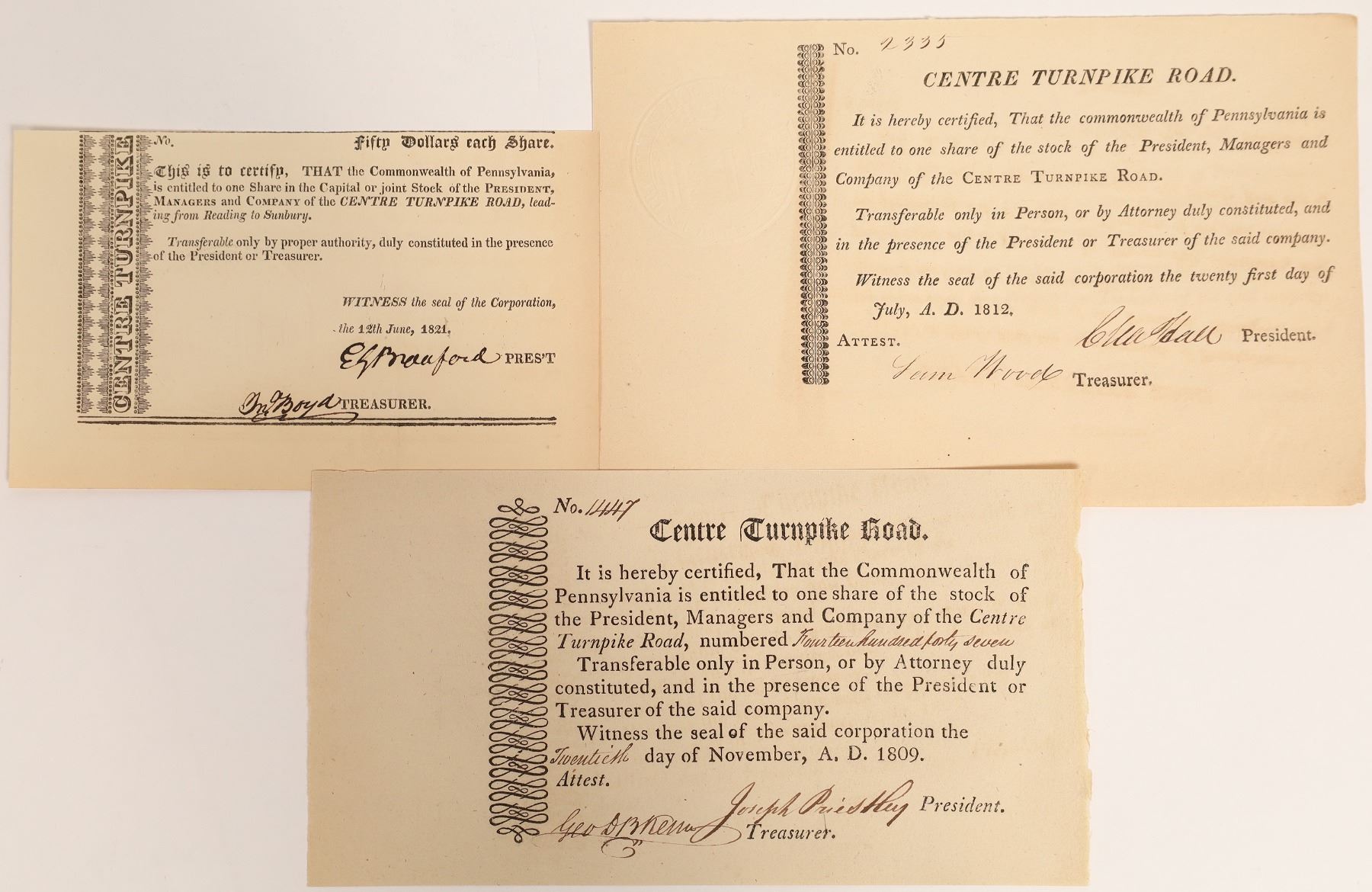 Three different varieties of the Centre Turnpike Road . The first of these certificates was issued in 1809, signed by Priestley. The second was issued in 1812, signed by Hall. The third was issued in 1821, signed by Bradford. Road was from Reading to Sunbury. The company was formed in 1805.