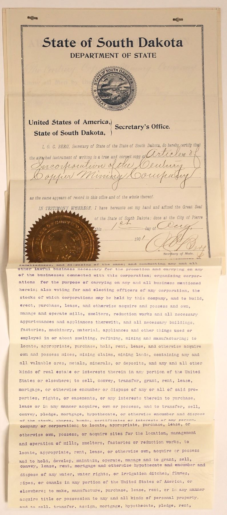 Original articles of incorporation dated 1900 for this Colorado miner signed by the three company officers: Boyer, King and Tallman. The document was signed in Arapahoe County, Colorado. There were 625,000 shares authorized at $1 per share. It appears that the company decided to change their state of incorporation to South Dakota in 1901, and that is reflected by this document. Large gold seal on the front. Typed pages showing the company's authorized activities and purposes. An interesting look into the legal matters of this mining company.