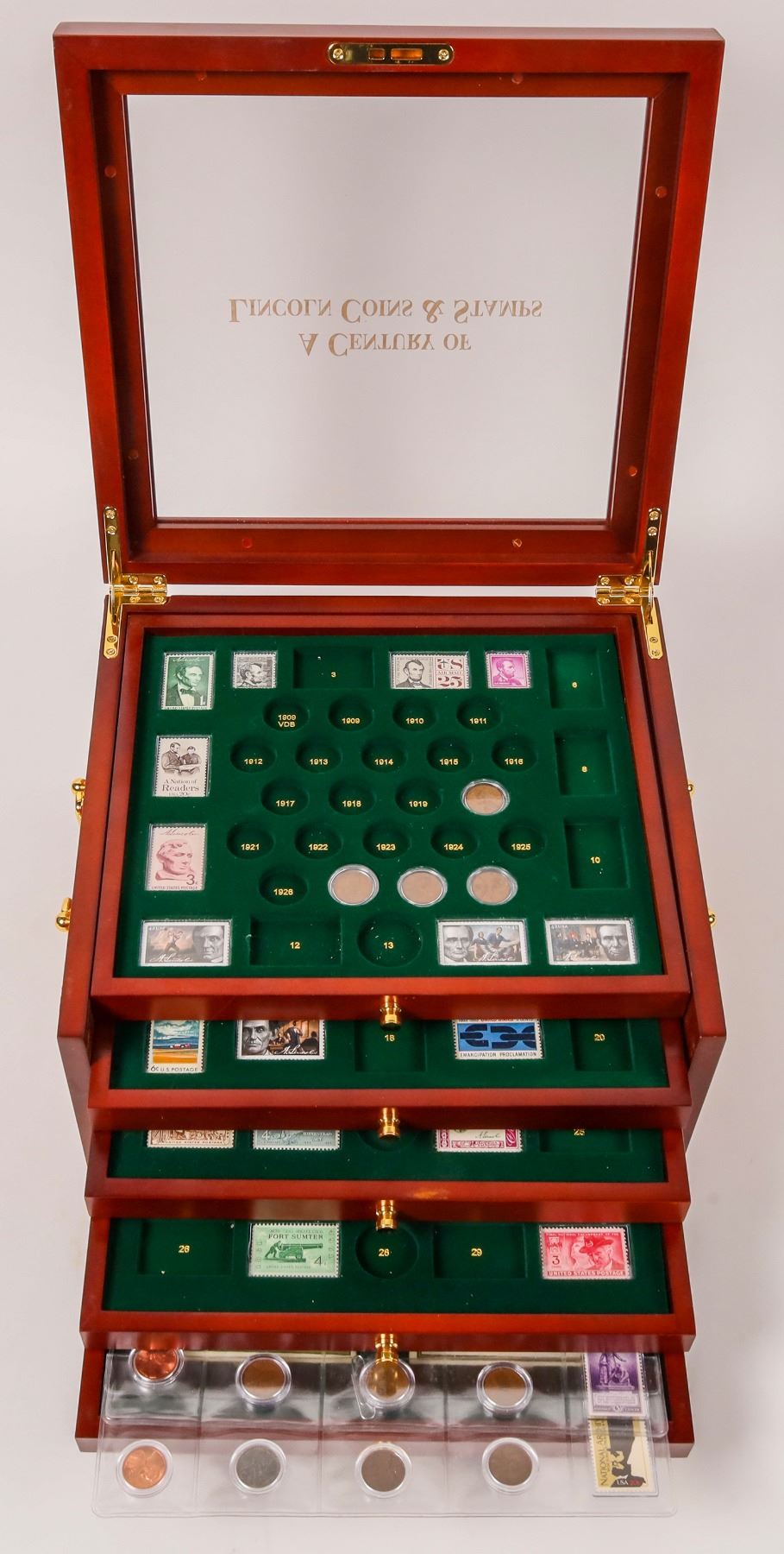 Issued by PCS Stamps and Coins: A century of Lincoln Coins and Stamps. Elegant glass topped wooden display case (12 x 1 x 7 inches) with five drawers for coins and stamps. 92 coins and 23 stamps are included. Nice presentation of Lincoln through history.