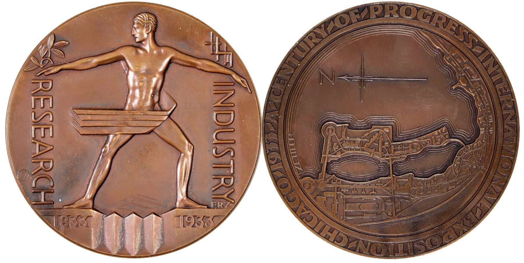 Like HK 463 but larger: bronze, 56 mm. Obv: Full male figure, nude with flowing loin-cloth, outspread arms and legs, on top of and astride pillars; under r. foot 1833, under l. foot 1933; under r. hand, vertical Research, © to lower l., leaves above hand; under l. hand, vertical Industry, below is microscopic E R Z, above hand is small graph. Rev: Relief map of Exposition grounds and lake, above is directional N arrow, to l. is small vertical Zettler (designer)--all within large center circle; outside around A - Century - of - Progress - International - Exposition - Chicago - 1933 -.