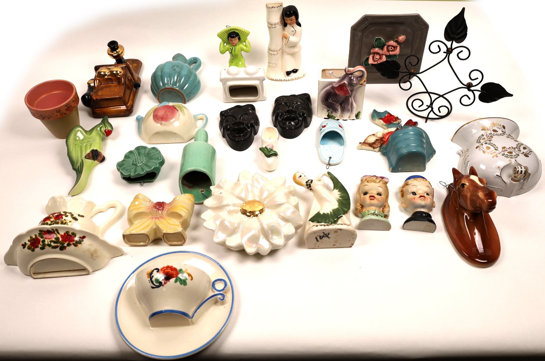 Twenty seven ceramic wall pocket pieces of varying designs, generally 4-8", with no maker's marks on the back or bottom. Please see photo. These were very popular in the American collecting scene after WW2.