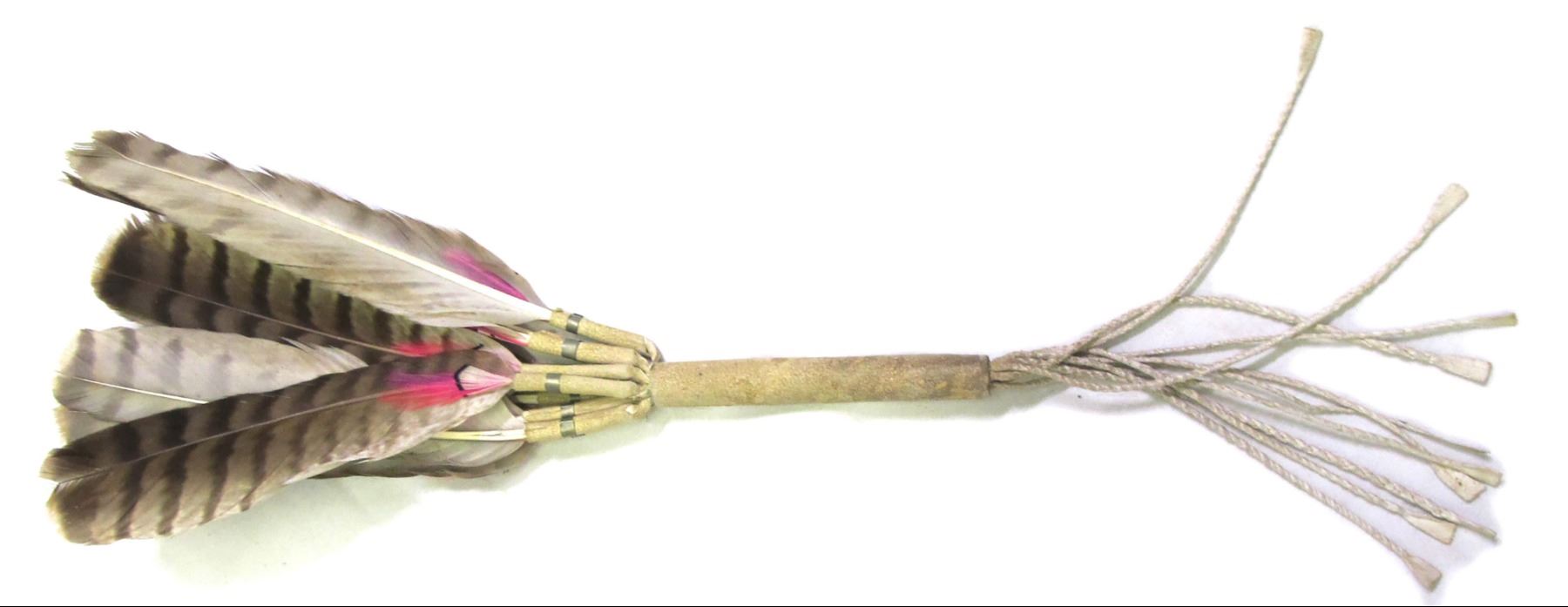 Used for Native American ceremonies. Has 11 feathers, multi color, with leather handle. 13" length, delicate. State: City: Date: 1900's HWAC# 83518