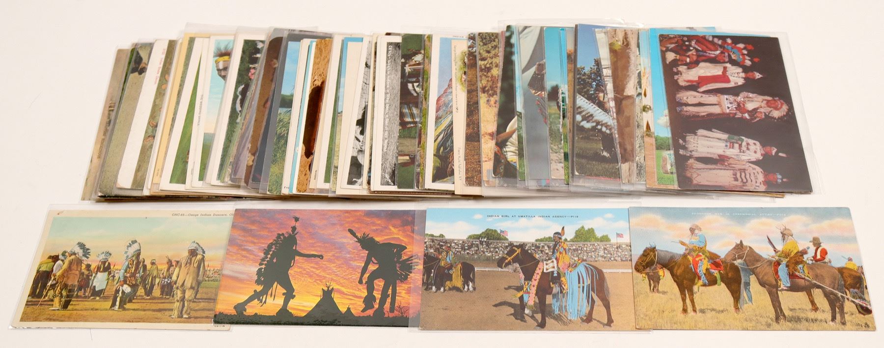 85 colorful postcards of ceremonial dress / full regalia. There are many duplicates of different types of dances. Postcards from different tribes such as Osage, Umatilla, Shoshone, Yakimas, Apache and Hopi.