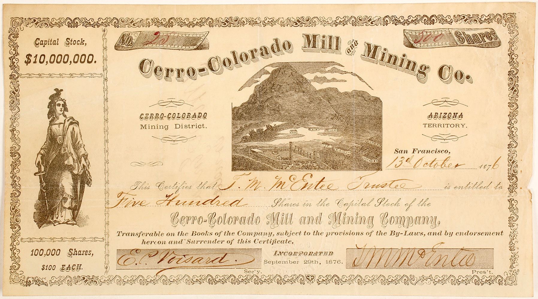 The Cerro-Colorado Mill & Mining Company. EARLY Number 25 for 500 shares to TM McEntee, trustee in 1876. Signed by secretary CP Voisard and president TM McEntee. Fabulous vignette of the Cerro-Colorado mining site! Good condition. Horizontal and vertical folds, edge issue on right. Incorporated on September 29, 1876. Light foxing on right. The silver mines of the Cerro-Colorado Mining district in Santa Cruz County have attracted the attention of miners who worked the narrow quartz veins in sedimentary volcanic rocks for several hundred years. Located 55 miles southwest of Tucson among the rolling grasslands along Arivaca Road between Amado and Arivaca, the Cerro-Colorado Mine is classified as one of the earliest mining operations after the Gadsden Purchase of 1854. Known for its high-grade surface silver it was worked by Charles D. Poston and Herman Ehrenberg from San Francisco, the former acquired $100,000 in cash to invest in 80 mining claims near the old Tumacacori Mission and the Santa Rita Mountains to the east.