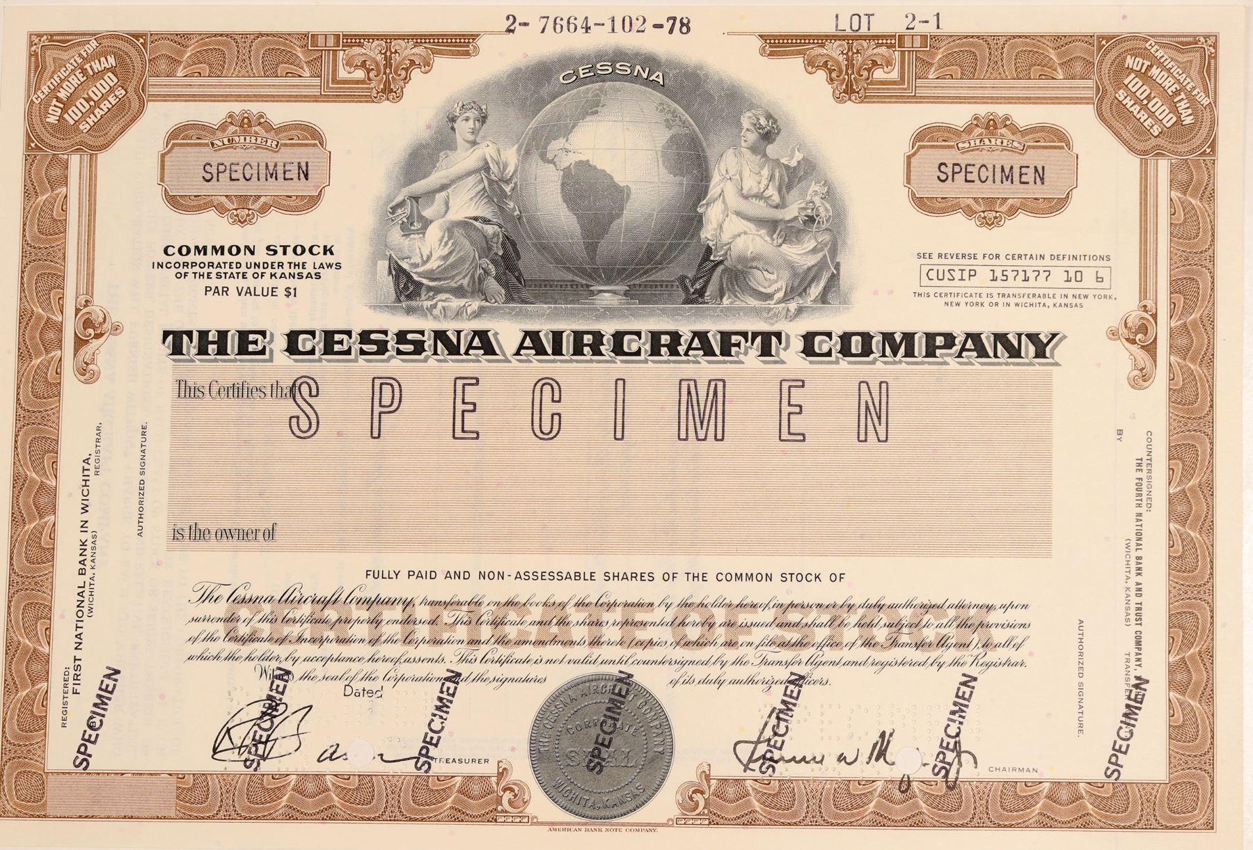 Clearly marked specimen throughout. Hole punched auto signed names. Cessna logo as vignette. One very small spot upper right border. No edge or corner issues. Extremely nice. Clyde Cessna, a farmer in Rago, Kansas, built his own aircraft and flew it in June 1911, the first person to do so between the Mississippi River and the Rocky Mountains. The Cessna Aircraft Company was an American general aviation aircraft manufacturing corporation headquartered in Wichita, Kansas. Best known for small, piston-powered aircraft, Cessna also produced business jets. For many years the company was one of the highest-volume producers of general aviation aircraft in the world. Founded in 1927, it was purchased by General Dynamics in 1985. Ken Prag Collection