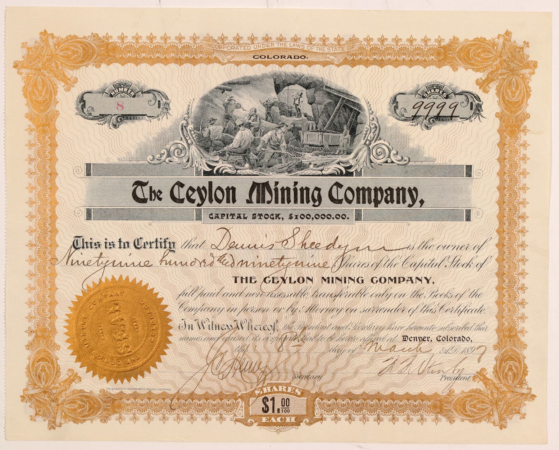 Inc. in Colorado. Low number 8, issued for 9,999 shares to Dennis Sheedyer on March 8th, 1897 in Denver. Signed by president Utinby(?) and the secretary (illegible). Not cancelled. Gold border and seal, black print, mining vignette. Printed by WH Kistler, Denver. 8.25 x 10.25" Folds, light wear. According to the Herald Democrat, March 5, 1897, the company was incorporated to operate in Lake County. Likely Leadville. Ken Prag Collection