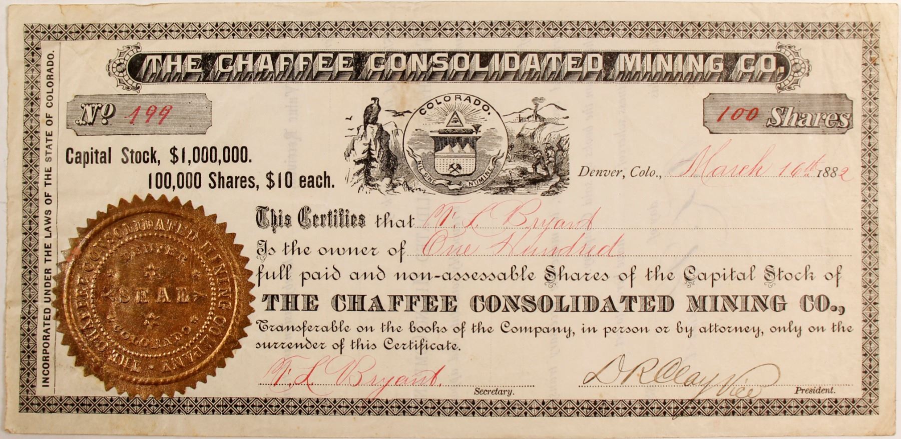 # 199 for 100 shares to FL Bryant. Signed by Bryant and vice president DR Clay. Dateline Denver 1882. Colorado seal vignette. no printer. Not cancelled. Staining upper center. Corners not crisp. Seems to be referring to Jerome Chaffee, Colorado's first United States Senator. Was Chafee the president? Ken Prag Collection