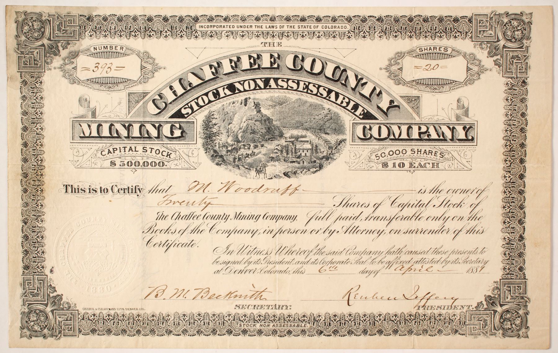 Number 393 for 20 shares to M Woodruff. Signed by BM Beckwith and president Reuben Laffery. Issued 1881. Incorporated 1880. Interesting unique looking vignette. Collier & Cleveland of Denver printer. Not cancelled. Three vertical folds. One pinhole at vertical folds. Staining upper left. State: Colorado City: Chaffee County Date: 1881 HWAC# 85206