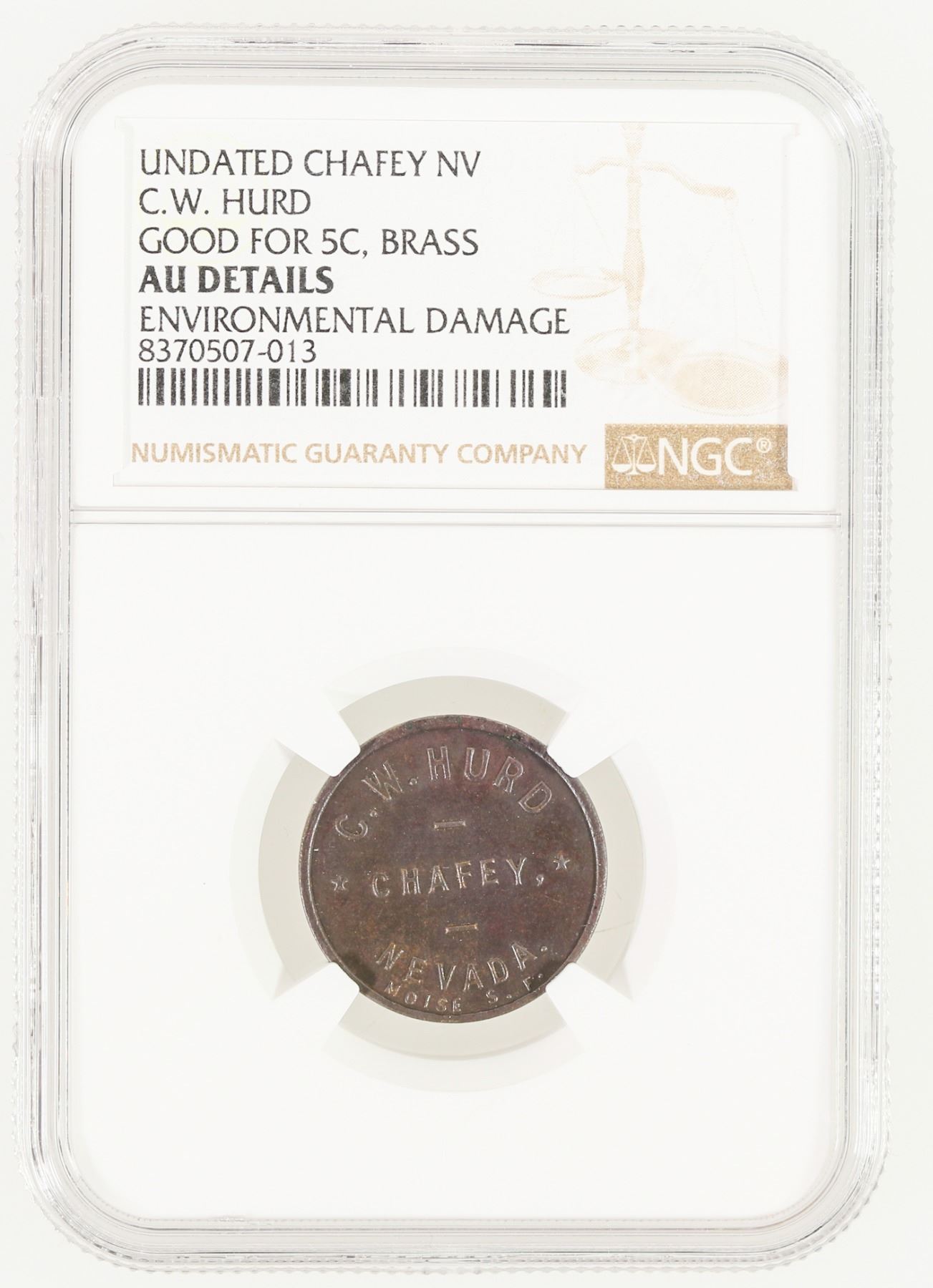 C.W. HURD / CHAFEY, / NEVADA. / MOISE S.F. // GOOD FOR / 5c / IN TRADE; Br., rd., 21 mm. Chafey was originally called Dun Glen, established in 1862. The mining camp became one of the largest towns in Northern Nevada but was abandoned by 1880. When silver was discovered in the area in 1908, the town was named Chafey. Mining stopped in 1913 and the town was abandoned.