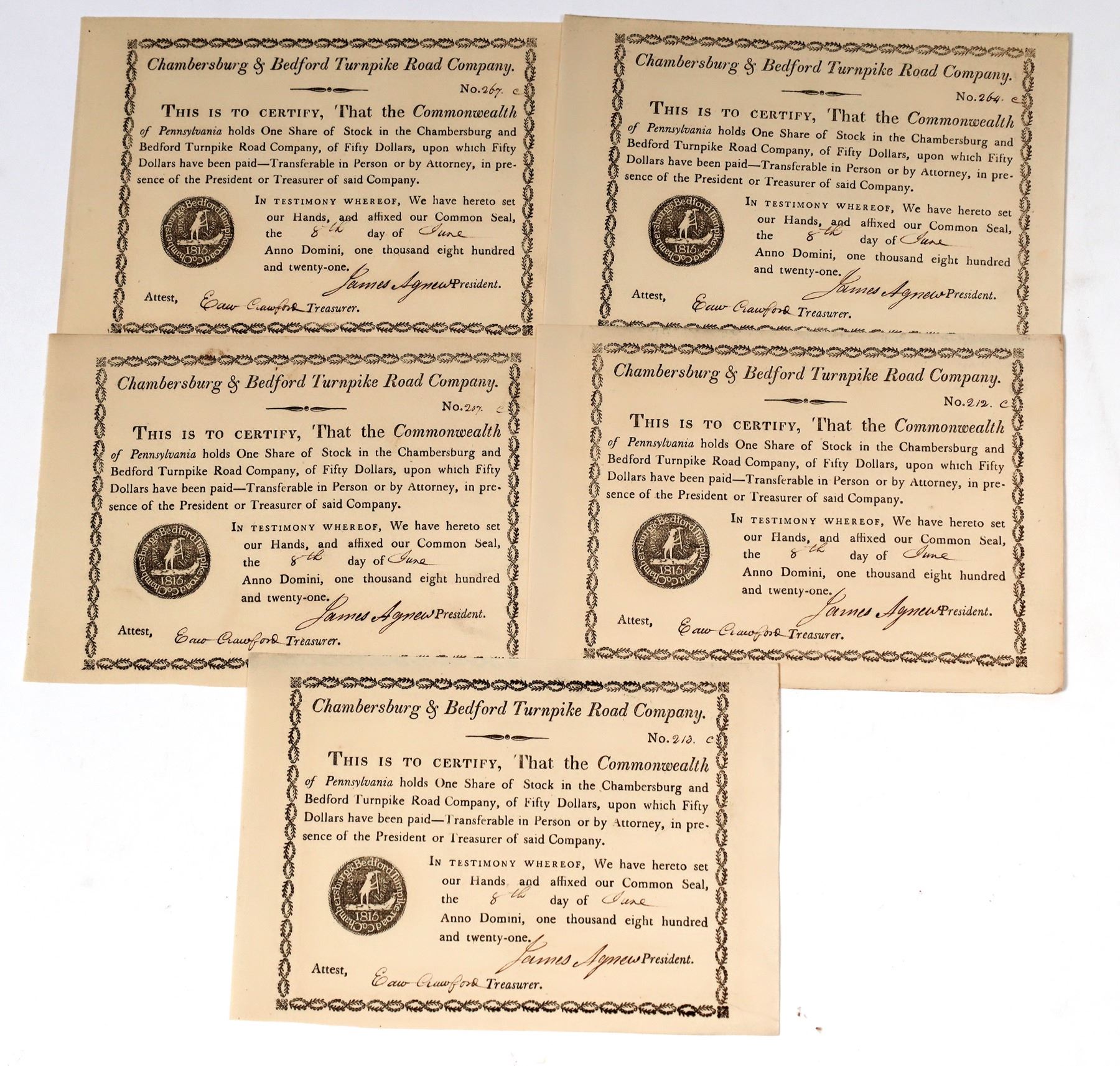 5 Chambersburg and Bedford Turnpike Road Co. stocks. Issued to Commonwealth of Pennsylvania 1821. Signed by James Agnew President and Eaw Crawford Treasurer.