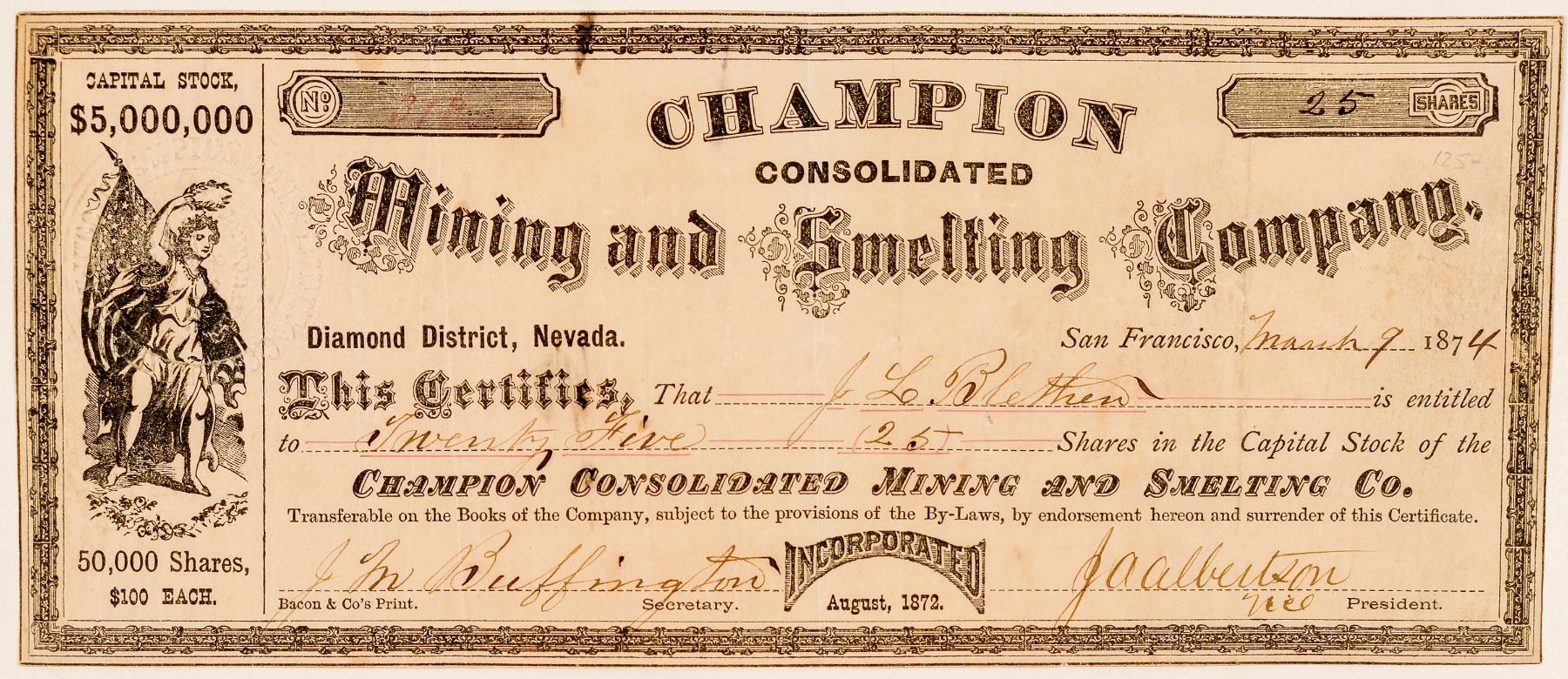 Rare. Diamond District, Nevada (printed under title). Inc. August 1872. No. 310, issued for 25 shares to J.L. Blethen on March 9th, 1874 in San Francisco. Signed by J.A. Albertson, vice-president, and J.M. Buffington, secretary. Not cancelled. Black border and print, vignette of allegorical woman holding American flag. Printed by Bacon & Co.'s, Print. 3.5 x 8.75" Pinholes, folds, some soiling, tear at corporate seal (in vignette). According to the Sacramento Daily Union, Sept. 2, 1872, the company formed to develop the Champion, Patriot, Perseverance, and Hidden Treasure lodes, Diamond Mining District, White Pine County, Nevada. By 1878, it was reported that the company owned the Champion lode and mill site. [Ref: Hand-book of Mining Law, 1878, pg. 156] Tingley describes a Diamond district in Eureka County, discovered in 1864. Likely it was right on the border between the two counties. () Ken Prag Collection