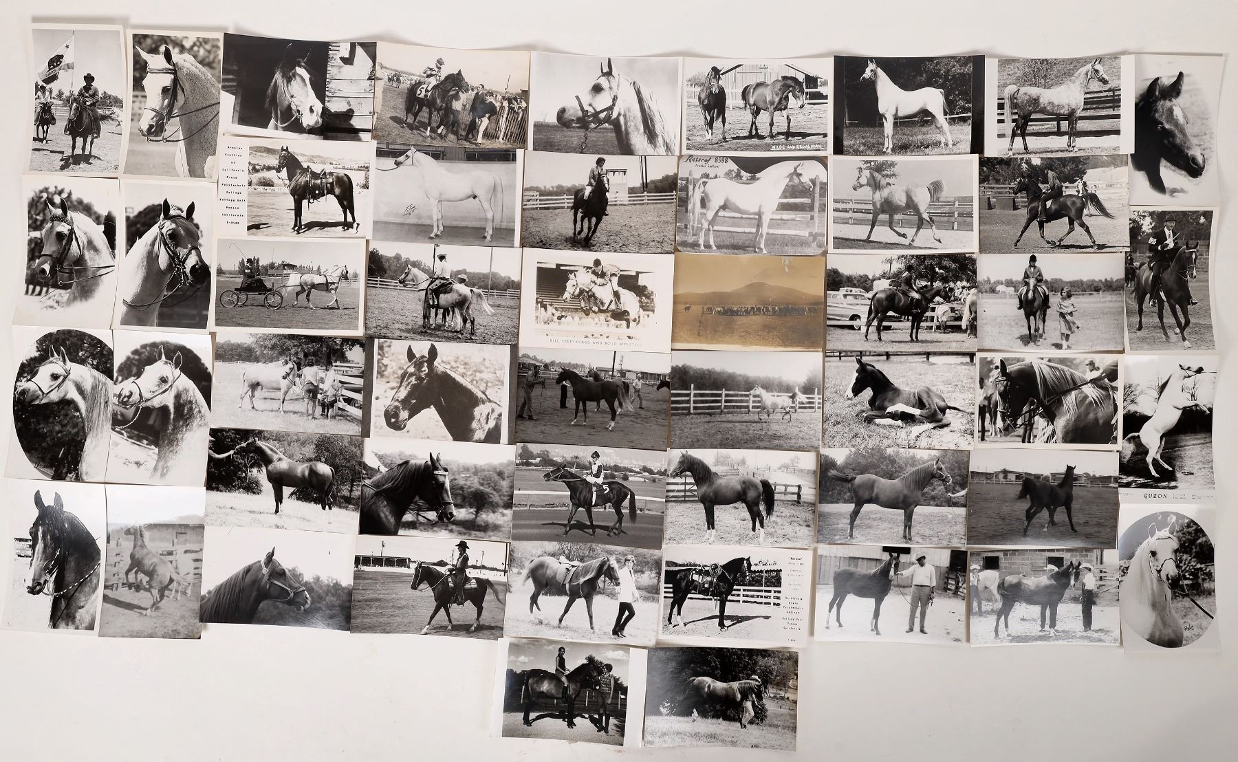 Lot of 50 . None are postmarked. All ground level views. Most are of just the horse. Some are with riders, jockeys, buggy race and a horse round up. Some of the listed reg. horses are: R-Safir (off sprg. Tut Ankh Amen), Rhoda off spring is Royal Lite, Guzon, Gazort, Rafferty and more. You can hunt down lineage at this link : https://www.allbreedpedigree.com/ 1920's-60's Ken Prag Collection