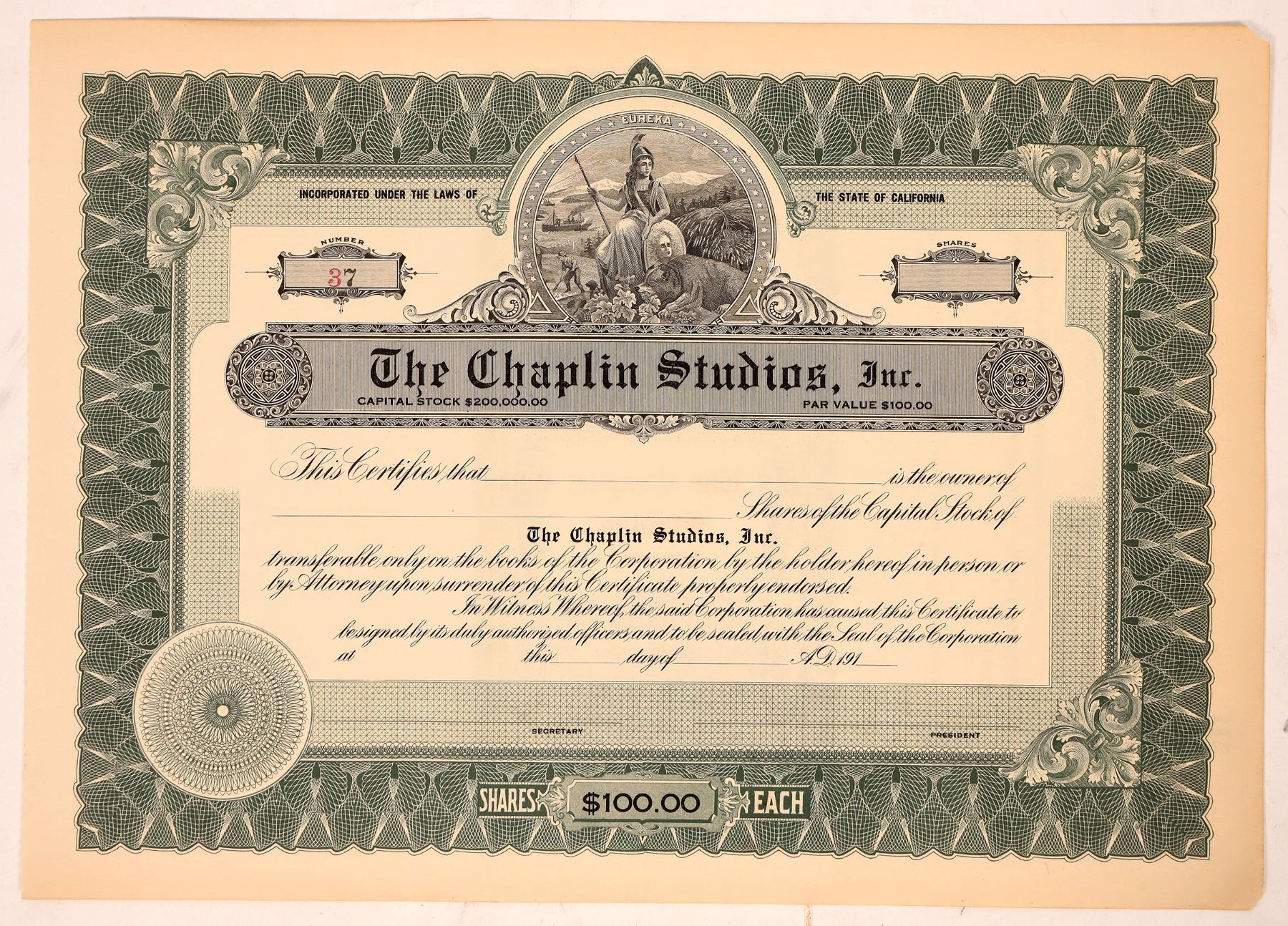 Unissued Chaplin Studios Incorporated stock certificate, No. 37, shares for $100 each. From the 1910's. [ California