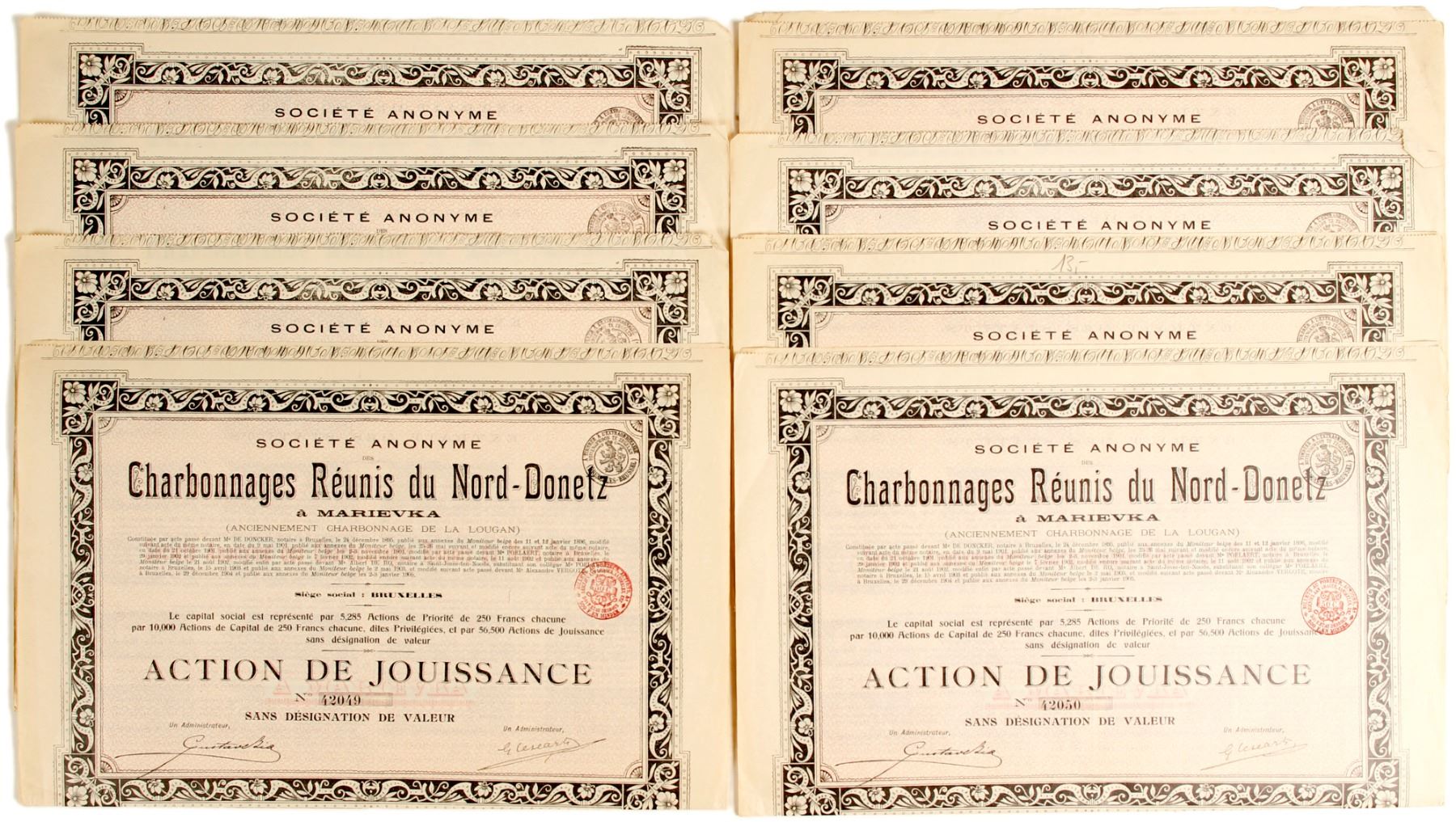 8 total certificates. All signed and NOT canceled by two administrators, illegible. Possibly from Belgium (?); all attached revenue coupons still attached; all in good condition, some tearing and discoloration. No history found during research via the internet.