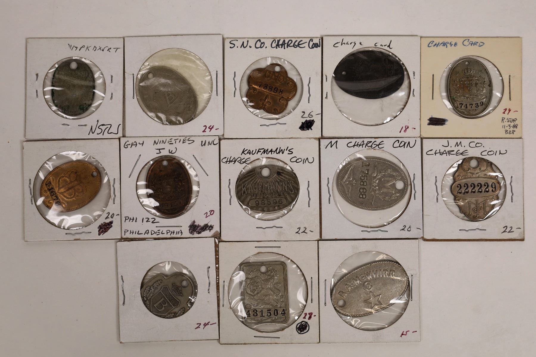 Lot of twelve examples of "charge coins" Charge (or credit) coins were first issued just after the Civil War, growing increasingly popular in the years leading up to the Great Depression. The basic concept was simple: metallic tokens, given out by merchants—taxi companies and department stores were especially active—embossed with an advertising message, sometimes a unique image, and an account number. A customer wanting to charge a purchase to their account would present the coin to the merchant. Kaufmann's "The Big Store", R. H. S., Blauner's, "M", J.M. Co., R. A. McWhirr, S. N. Co.