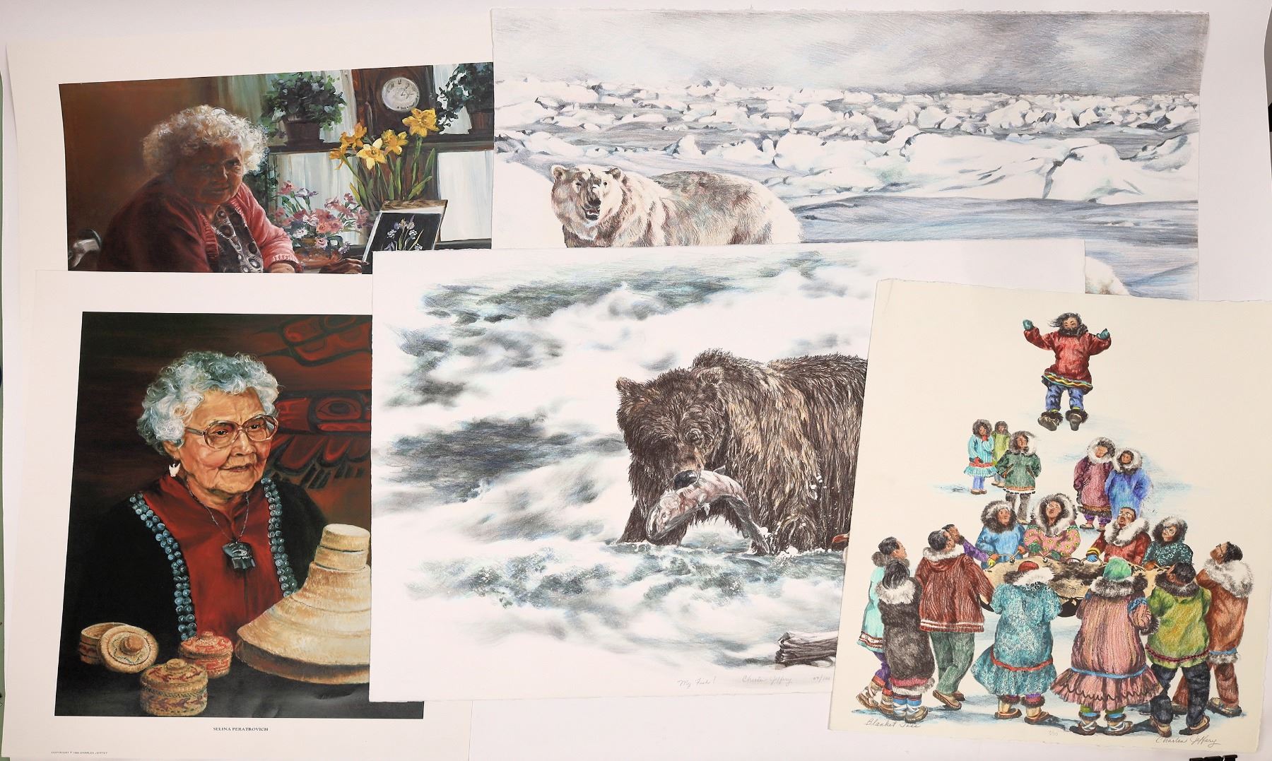 3 vibrant Alaskan artist Charlen Jeffrey limited edition prints, all signed and numbered. Blanket Toss 22.5x18", 7/50. My Fish 22x30", 7/100. Afternoon Stroll 22x30", 7/100. 1983 print Selina Peratovich. Signed 1982 print 7/25 artist proof of an older woman.