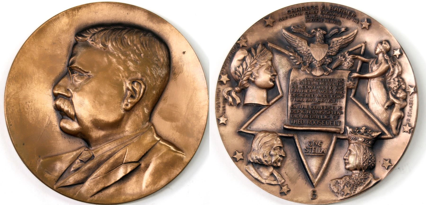 Three-inch diameter copper medallion struck in tribute of Charles E. Barber and bearing an image of Theodore Roosevelt on the obverse. The reverse reads at the top: // CHARLES E. BARBER / THE SIXTH CHIEF ENGRAVER OF THE / U. S. MINT / MDCCCXL-MCMXVII //. The shield at the center reads: // . . . UNEXCEEDED AS / A STEEL ENGRAVER, / HE CONTINUED HIS FATHER'S WORK AND / DESIGNED MORE COINS / THAN ANY ARTIST. . . //. Below this it continues: // ON THE OBVERSE IS / DEPICTED HIS SPLEN- / DID MEDALLIC OF / THEO. ROOSEVELT //. And below that is // ONE / STELLA // in the lower point of a five-pointed star. Below that point is a / B /. Surrounding the star are fanciful characters and an American-style eagle at the top. As engraved on the edge, the piece was struck by the Metal Arts Company of Rock, New York, not Medallic Art Company. In tiny letters at the nine o'clock position appears: // COIN MEDALS / (C) 1962 / T. JOHNSON // and at the three o'clock position is: // R. SCHABEL //, possibly the names of the designer and of the engraver of this medallion. Weight is 180 grams.