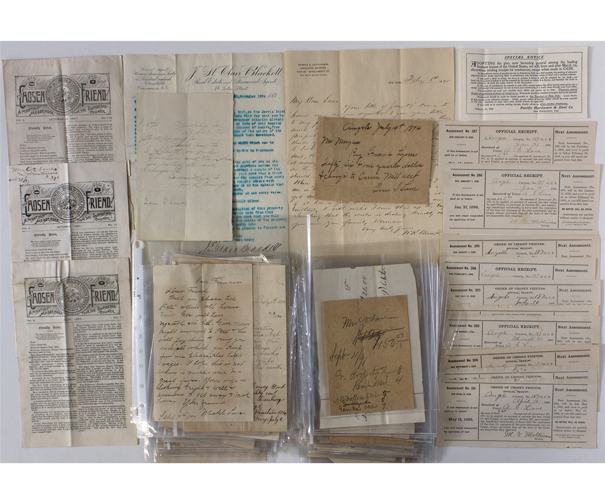 Approximately 80 pieces. Includes notes, letters, and business correspondence. Lane was the superintendent of the Utica Mine. Items include a letter from Canada on his interest in the Jervis Inlet Quartz Company. A 1895 letter from Wemple & Hutchinson where "I just made them smile to think of any one asking $550,000 for a prospect...." It also includes several editions (and receipts) of the Chosen Friend. The Chosen Friend was an Evangelical Magazine and Missionary Chronicle. The collection is mostly business payments to the Carvin Mill, hauling wood, hauling sulphurets, etc.City: Angels CampCounty: CalaverasState: CADate: