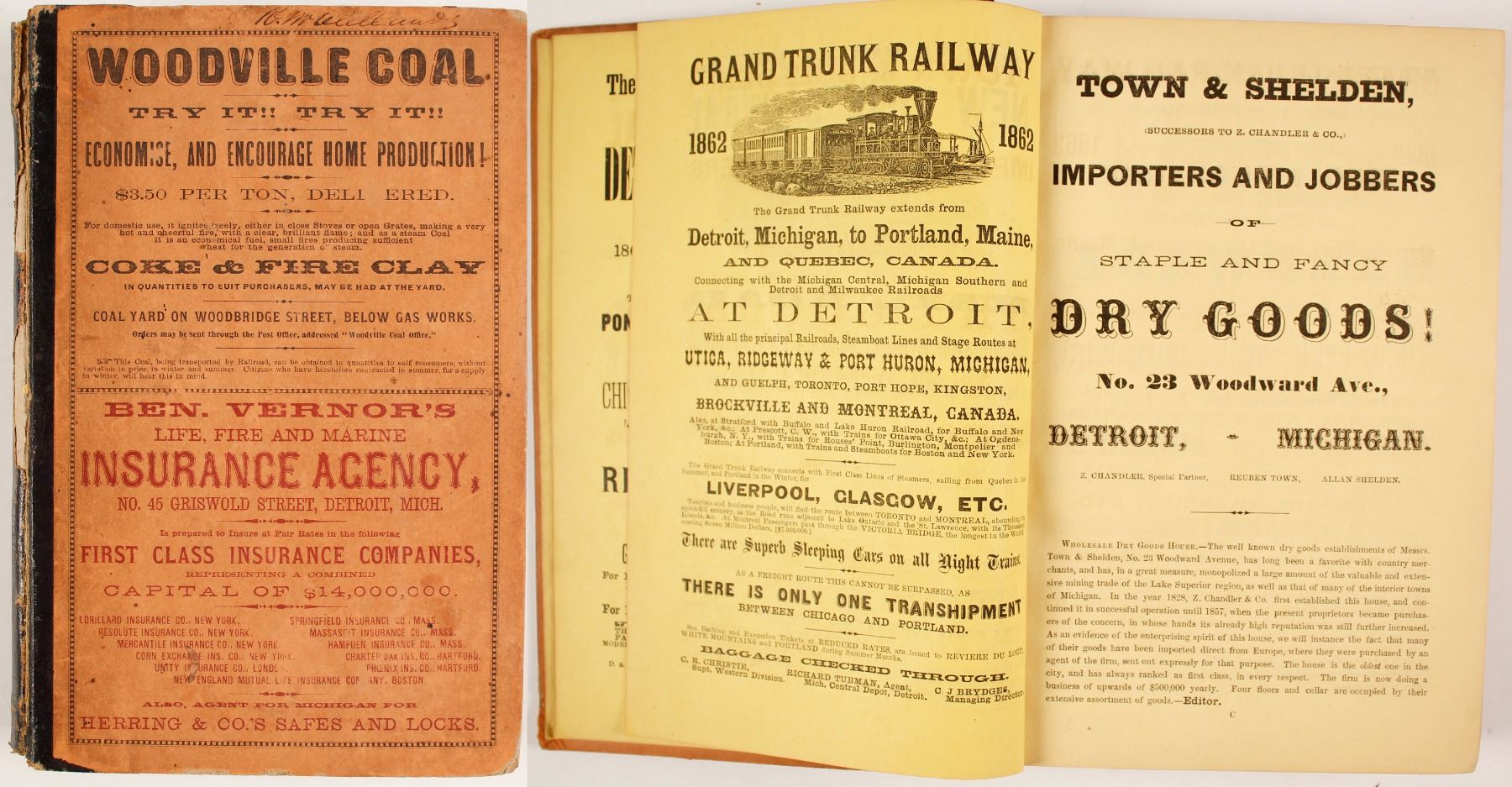 Charles F. Clarks Annual Directory City of Detroit for 1862 to 3 by Richard Edwards, published by Charles Clark 1862. Previously owned by R. W. Cleveland. 356 pages with original binding. Front cover almost detached. A nice, early Detroit directory with high-quality printer samples inside.