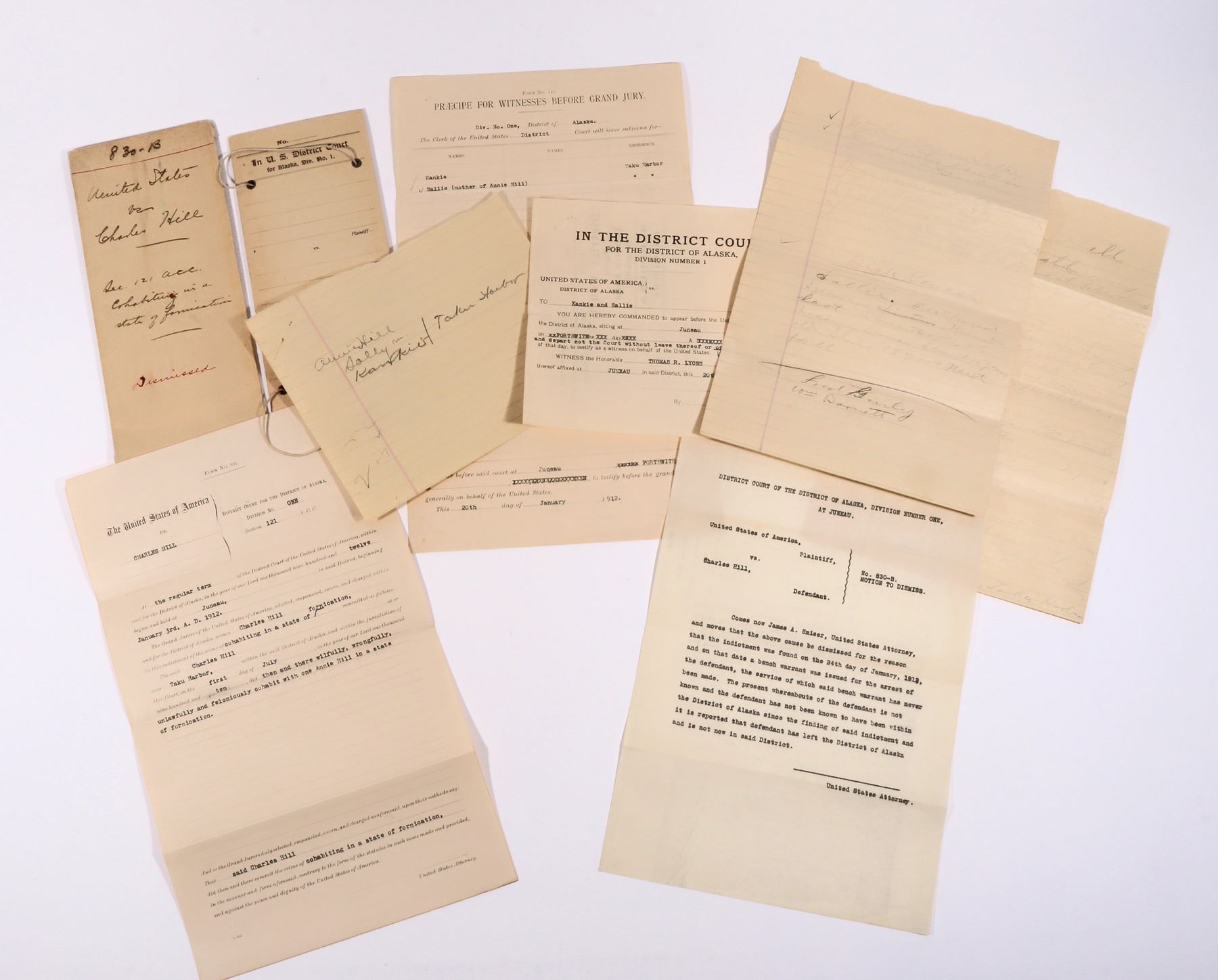 With Annie Hill!? Dismissed in 1912 after Charles disappeared and was never seen again. Four legal documents, three handwritten notes, and two envelopes. Alaska Taku Harbor 1910