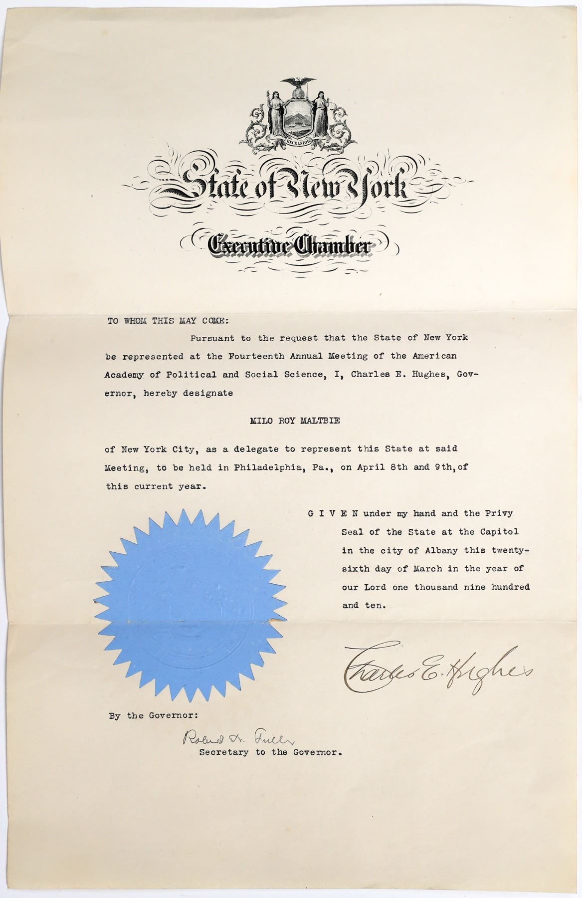 1910 State of New York document designating a delegate to a meeting. Nice clear signature by Governor Charles E Hughes. 16x10.25".