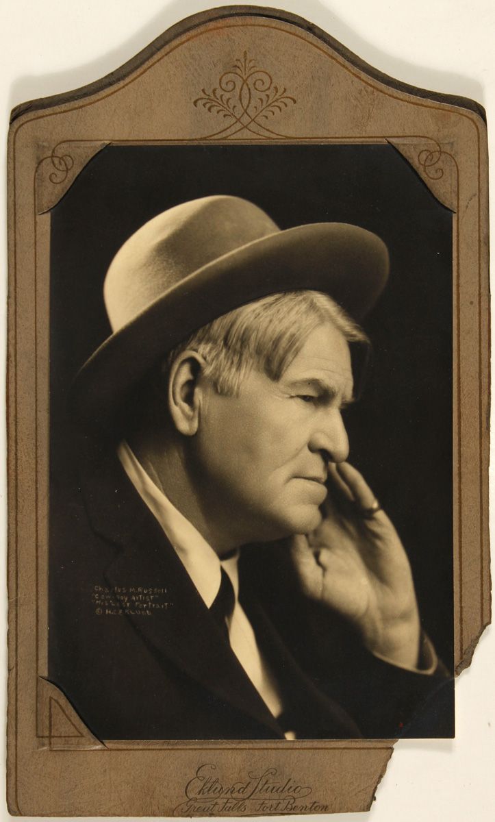 This collection belonged to Jesse Lincoln Mitchell, who at one time lived next door to Charles M. Russell in Montana. The collection contains three two-sided drawings by Charles M. Russell. The pieces are framed with double frames attached to each other, with mats and double glass, so they can be viewed from both sides. the frame size is 20" H x 16" W. The drawings are of horses, Indians, cowboys, dogs, buffalo, bear—studies that were used for his paintings. Photos of some of the paintings that were sold from the collection are in this collection. There are several photographs of Charles M. Russell (including an original photo of Russell taken October 17, 1926 just days before he died on October 24, 1926) and his home and studio in Great Falls, Montana. California collector Bill Burger acquired this collection, along with several other pieces of original Russell art many years ago.