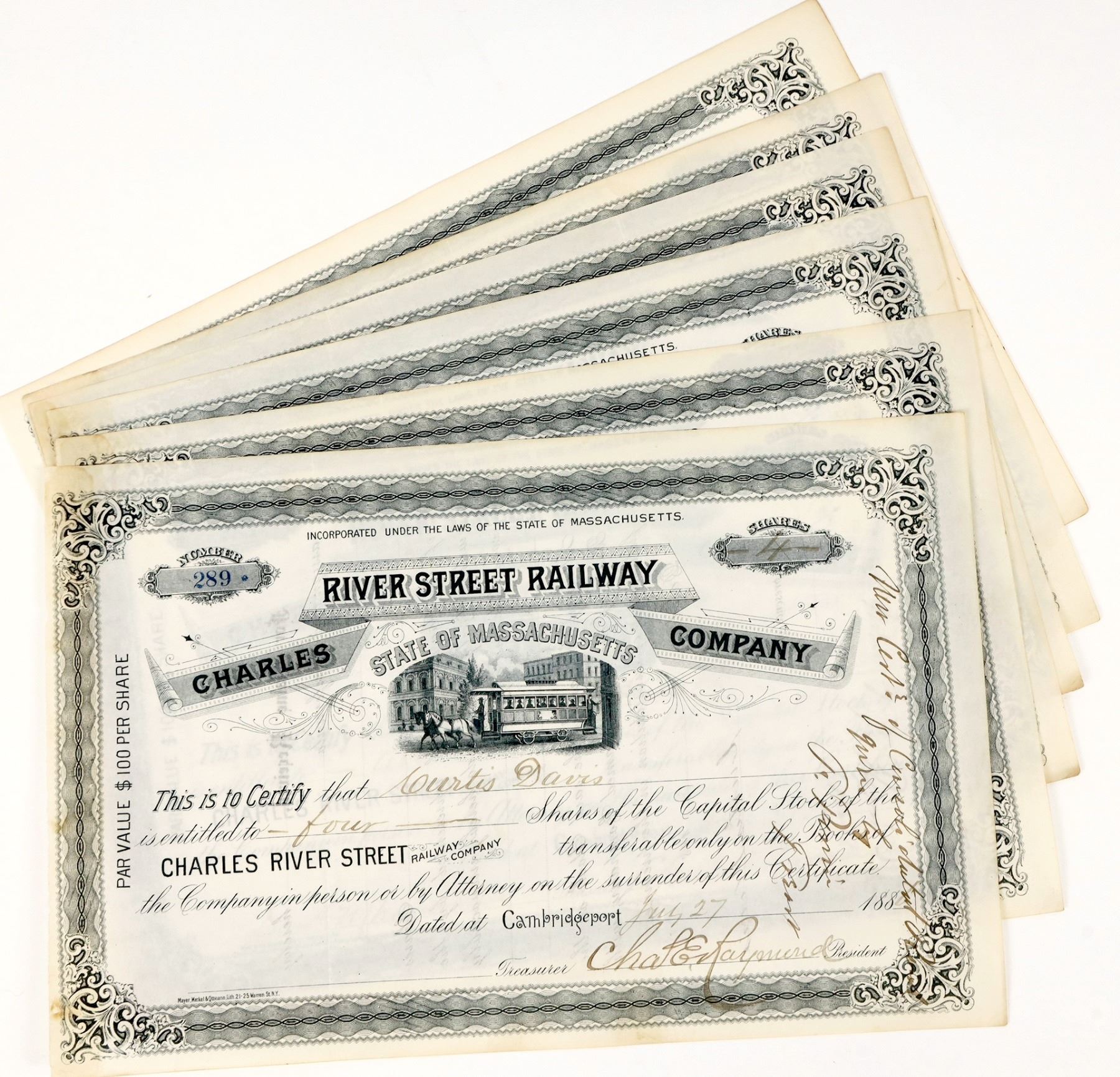 Group of 6 stock certificates from the Charles River Street Railway Company, issued 1885 to 1886. All but one issued, two cancelled with handwritten cancellations. Nice vignette. 10.5"x6.75 certs, some minor toning/discoloration; see photos.