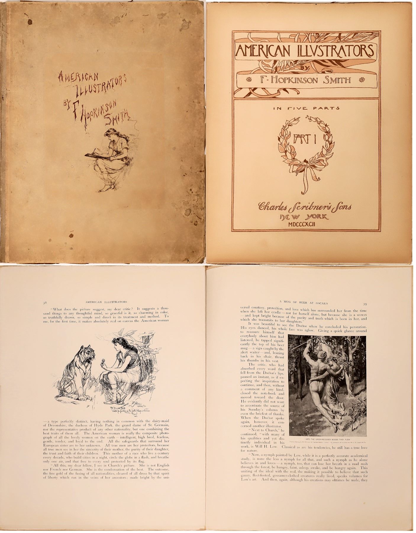 Limited Edition no. 969 of 1000 of American Illustrators by F. Hopkinson Smith, published by Charles Scribner's Sons, New York, 1892. Hardcover. Light brown board covers. Front cover presents illustration of woman writing in her journal beneath Title and Author. Oversize. 17 x 13 inches. Portfolio style publication. Consists of 5 booklets (Parts I - 5). 68 pp total. Many B&W text engravings throughout. Also, only 6 of 15 original plates still present. Part 1 includes the title page, list of plates, list of illustrations, one-page introduction, and the first essay. Each Part presents a different essay. Each Part includes one or more plates. Each plate is preceded by a printed tissue guard with the title of the plate and the artist's name. Plates still remaining in this collection are: A Wounded Enemy/Howard Pyle, At Noon Time/WT Smedley, The Rower/Winslow Homer, Napoleon at Waterloo/RF Zogbaum, Engraving from Nature/Elbridge Kingsley, and That Delicious Moment/Charles Dana Gibson. Condition: board cover & spine intact, 5 Parts/booklets loose within. Plates loose from booklets. Covers worn w/tears on back top.