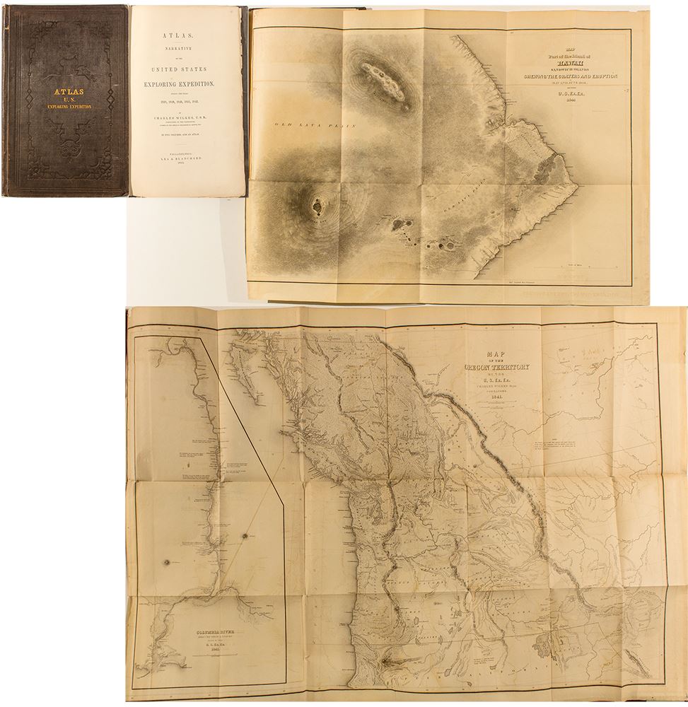 Atlas, Narrative of the United States Exploring Edition, During the Years 1838, 1839, 1840, 1841, 1842. By Charles Wilkes, U. S. N., Commander of the Expedition, Member of the American Philosophical Society, etc. In Five Volumes, and an Atlas Published by Lea & Blanchard, Philadelphia, 1845. Book measures 11 3/8" x 7 5/8". Linen dark brown hard cover, embossed with a design and gold lettering, back cover gold printed eagle over shield, ships and horn of plenty. This book contains five maps: 1) Track Map (World Map, 25.5" x 35.5"); this hand-colored map shows the tracks of the vessels of the Exploring Squadron, the direction of the winds, the currents, their direction and velocity, the isothermal lines for every five degrees of temperature, from the point of perpetual congelation to the Torrid Zone. 2) Map of the Antarctic Continent (25.5" x 35.5")--this is the first map ever of any portion of Antartica. It has several illustrations in the left portion; It exhibits the daily tracks of the vessels along the land discovered by the Expedition....3) Map of the FeeJee Group (25.5" x 35.5") ; this extremely detailed map embraces the Viti or FeeJee Group, consisting of one hundred and fifty-four islands, with numerous coral reefs, etc. 4) Map of the Oregon Territory (25.5" x 35.5") --the prize of the Atlas; map contains the first detailed mapping of the Columbia River; this embraces the United States possessions west of the Rocky Mountains, and also shows Fremont's Pass through the Rocky Mountains; the map is so finely detailed--it covers the area from Vancouver Island down to Mt. Shasta and east past Salt Lake (labeled as Youta Lake), locates dozens of missions, forts, and even labels numerous Indian villages. Map of the Southeast Portion of Hawaii; this beautiful map ( 17.75" x 24.75") exhibits the two remarkable volcanic mountains visited by the Expedition, with their numerous craters, together with the great eruption of 1840, and the track of the party to and from the center of Moku-a-weo-weo, on the top of Maunal Loa. Also, several villages and towns are mapped including Hilo, Waiakia, Puna and Kehena.