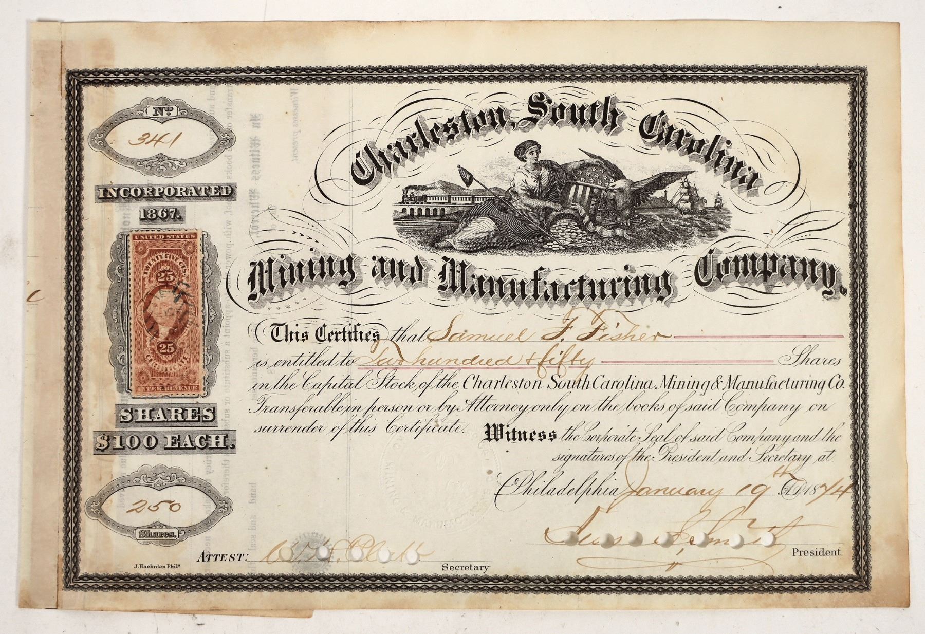 Rare South Carolina phosphate mining operation. No. 341, issued for 250 shares in 1874 to Samuel Fisher. Heavily punch cancelled signatures. Allegorical vignette. Discoloration on left border. According to an Oct. 25, 1877 article in the Daily Territorial Enterprise, this was a phosphate mining company operating with others on the deposits of the Ashley, Stono, Wando, Ashepoo and other rivers in South Carolina.