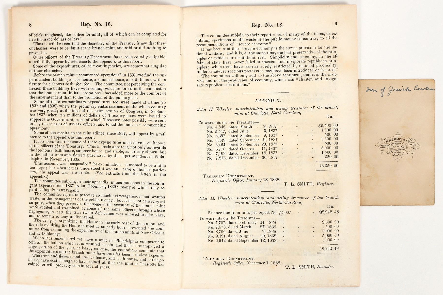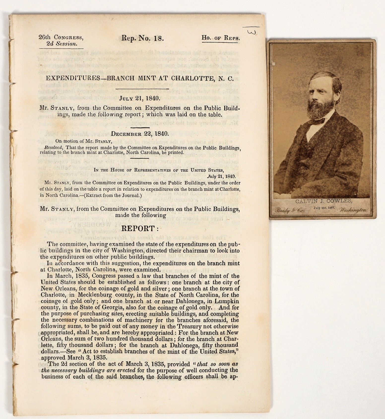 1840 report to House of Representatives regarding expenditures at Branch Mint at Charlotte-4pp have slight lower paper loss. Rare CdV by Matthew Brady of Calvin Cowles, assayer of Charlotte Mint and prominent Republican in Wilkes county. From the report: "Before the branch mint commenced operations in 1837, we find the superintendent building an ice-house, a summer house, a bath-house, ....The committee, not perceiving the connection these buildings have with coining gold, are forced to the conclusion that the branch mint, in its operations, has added more to the comfort of the superintendent than to the promotion of the public good."