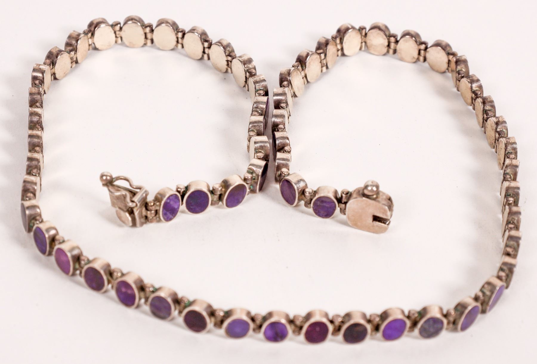 Sixty different Charoite oval stones set in silver form this incredible (varied in purple color) necklace. 18" length. Possibly Native American, but probably Mexican made because of silver work style.
