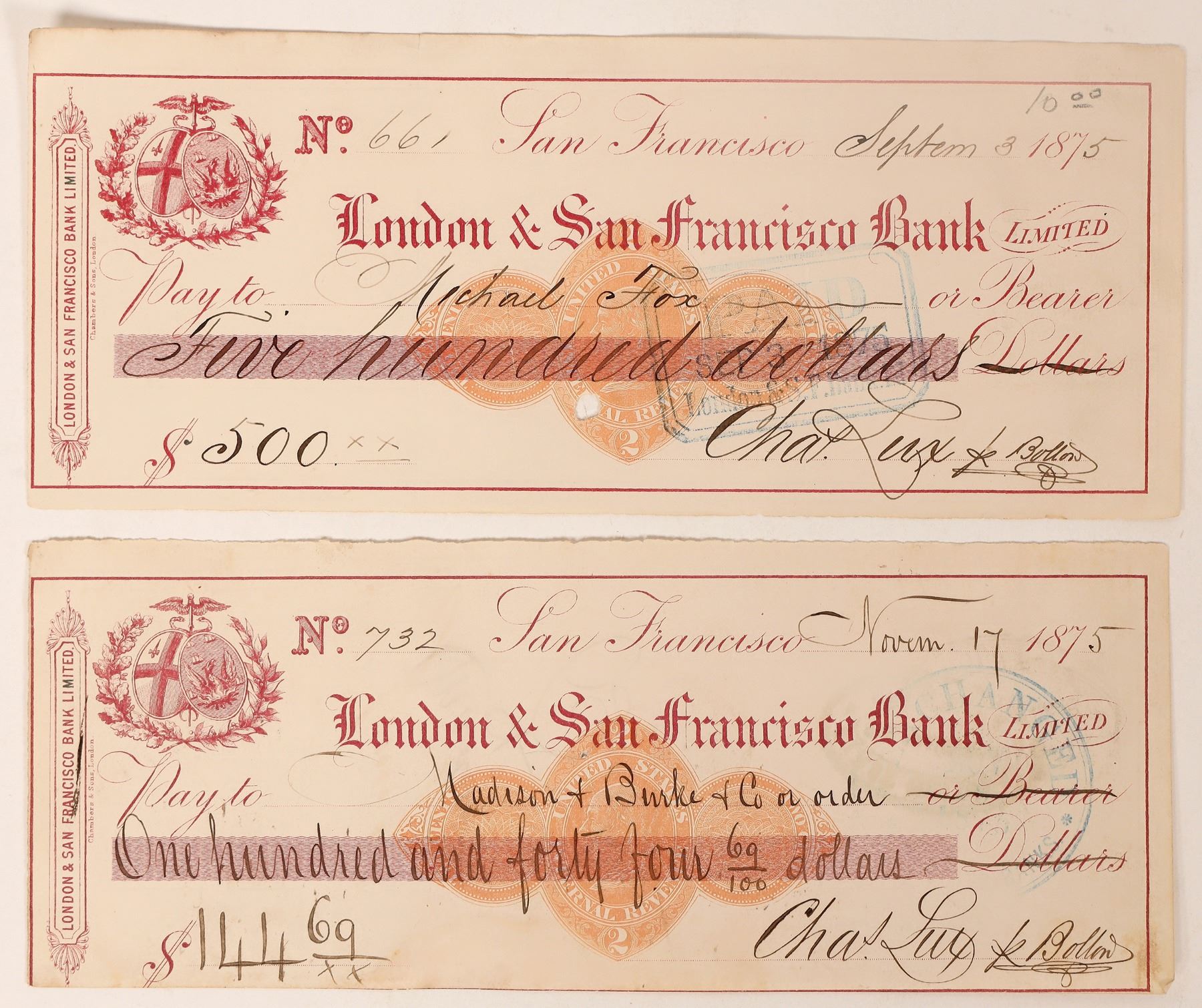 Lot of 2: 1875 checks from Chas. Lux signed for by Bolton. Miller and Lux was the largest cattle ranch in California in the 19th century. Both with imprinted RN D stamps. [San Francisco] [California]