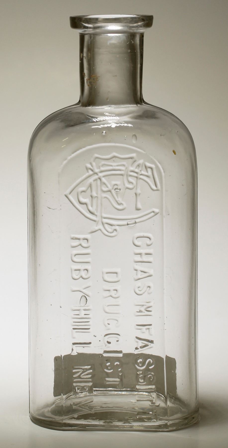 ( Monogram) Chas. M. Fassitt / Druggist / Ruby Hill, Nev. Base: W.T & Co / AA // Clear, Tooled top, 5 1/8" x 2 3/16" in size. Super mint , with tiny bruise on the back base edge, and also a small flake on the front base edge as well.. Best one on the planet !!. Very desirable, and extremely rare. Also the name is Mis- spelled Fassitt, and should be : Fassett"... So, really desirable...(RH).