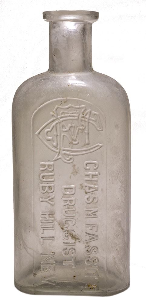 Charles M. Fassitt, Druggist, Ruby Hill, Nevada. “WT & Co.” embossed on face. Classic 4 ounce size, 5 inches tall. This bottle is a pristine choice example, with no chips dings or scratches of any kind. It only retains a little bit of original stain. Ruby Hill was a small mining camp 1 mile west of Eureka Nevada. It housed one of the largest silver mines in Nevada, which today is one of Nevada's great open pit gold mines. At one time for there were only two mint examples of this bottle known, one in the Haddock collection and the other in the Bob McKay collection, who was the caretaker of Ruby Hill. Holabird eventually acquired both bottles and this is probably one of the two. Since that time several others have been dug, but this remains one of America's top ghost town drugstore bottles. City: Ruby Hill State: Nevada Inventory Number: 38760