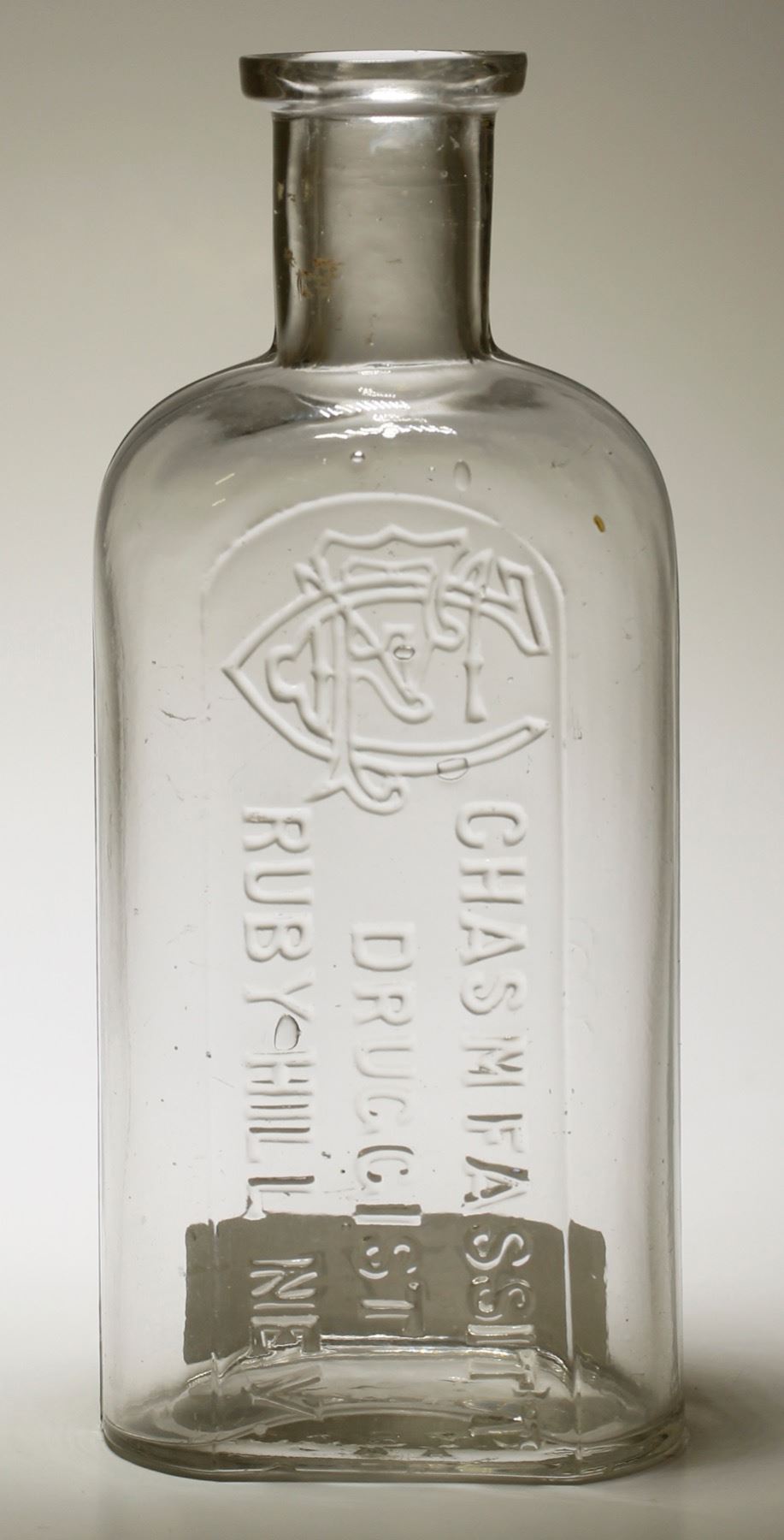 ( Monogram) Chas. M. Fassitt / Druggist / Ruby Hill, Nev. Base: W.T & Co / AA // Clear, Tooled top, 5 1/8" x 2 3/16" in size. Super mint , with tiny bruise on the back base edge. Best one on the planet !!. Very desirable, and extremely rare. Also the name is Mis- spelled Fassitt, and should be : Fassett"... So, really desirable...(RH). State: Nevada City: Ruby Hill Date: Pre-1883 HWAC# 57775