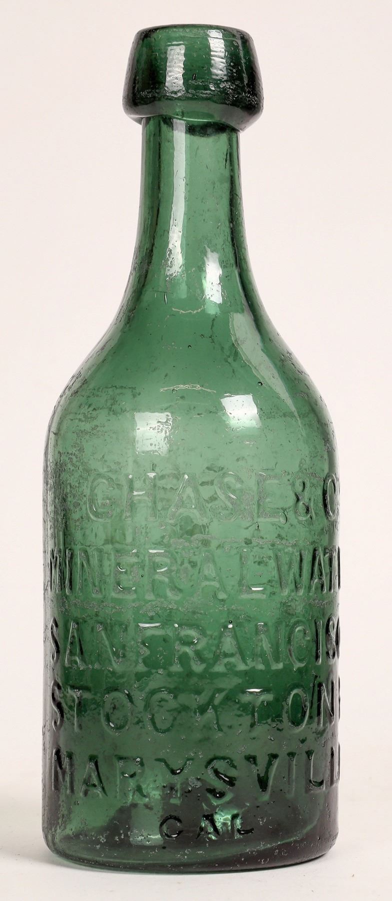 Medium green Chase & Co./Mineral Water/San Francisco/Stockton & /Marysville. c. 1853-1855. In 1856 A W Cudworth assumed ownership of Chase & Co. at Vallejo & Pinckney, San Francisco. Page 13 in Markota. Heavy case wear throughout the body, and etching. Nice and clean, with no chips, dings or other flaws. San Francisco/Stockton/Marysville California