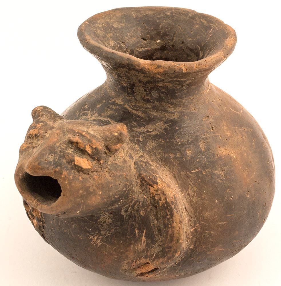 Bradley collection. Original clay pot, approximately 6 inches diameter and tall, with a three-dimensional face of an unknown animal protruding from the pot with an open mouth as a pour spot. This is the only complete pot in the Bradley collection, and exactly where she found it is unknown. It resembles many of the clay pot shards that Mrs. Bradley picked up over the years in the Chattahoochee region near Roswell. This is an important pot, figural, complete, with minor damage, as expected. It was a prized piece in the Bradley collection. Date: Location: Georgia HWAC # 51069