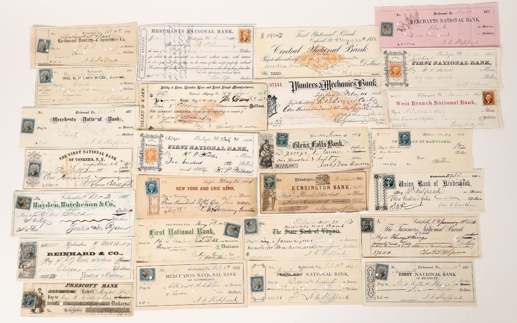 c. 1862-88 check group with 3 RN facsimiles and the 2 color pairs of bank checks with 2c Internal Revenue stamps, R9 Express, R5 imperf., R104. Some pictorials. c1862-88