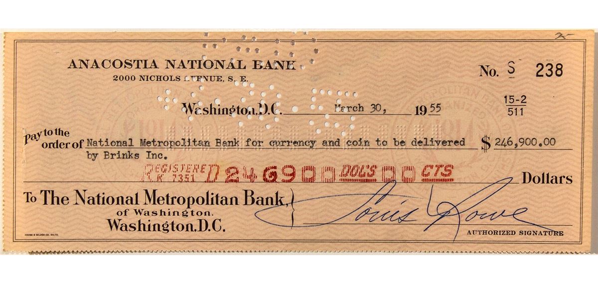 Interesting, numismatic-themed check. Anacostia National Bank, Washington D.C., March 30, 1955. Pay $246,900 to the National Metropolitan Bank for currency and coin to be delivered by Brinks Inc. Signed by Louis Rowe. Punch cancelled. (Prag Collection)