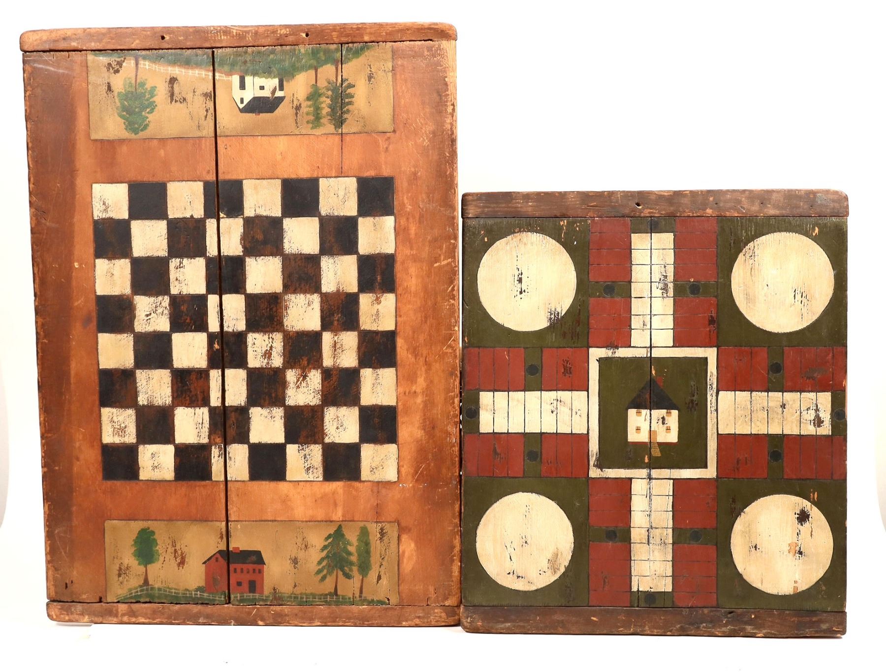 A checker/chessboard two-sided and a parchisi board. Chess board measures 20"x 28", is hand painted and has a large age crack down the center. The parchisi board measures 18"x 20" and has a seam in the middle. Both are payable or hangable. Please see photos for more details.