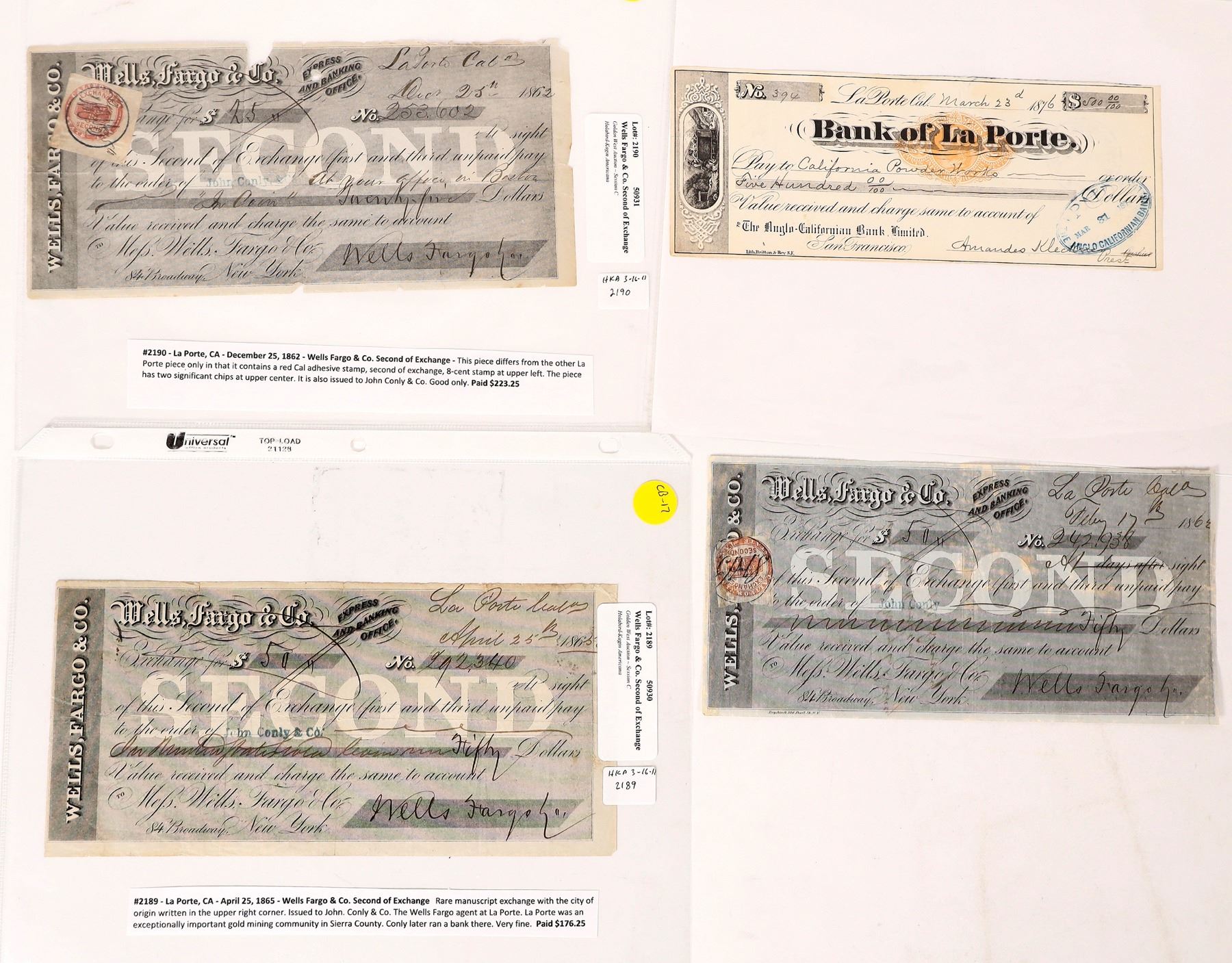 Lot(x4) of paid checks related to the town of LaPorte and famous bank John Conly. Includes: 1) Wells Fargo & Co. bank check No. 242938, dated February 17, 1862, issued to John Conly & Co. (in blue, stamped), black on grey, with red 8-cent California State second exchange revenue stamp, signed "Wells Fargo Co." 2nd (large letters). 2) Wells Fargo & Co. bank check No. 253602, dated December 25, 1862, issued to John Conly & Co. (in blue, stamped), black on grey, with red revenue stamp, signed "Wells Fargo Co.". Piece has 2 significant chips at upper center. 8-cent red California State second exchnage revenue stamp. 3) Wells Fargo & Co. bank check No. 292340, dated April 25, 1863, issued to John Conly & Co. (in blue, stamped), black on grey, with red revenue stamp, signed "Wells Fargo Co." Very Fine. All three Wells Fargo & Co. checks with city of origin (La Porte, Cal) written in the upper right corner. All rare. 4) Bank of La Porte check No. 394, issued to California Powder Works on March 23, 1876. Black on creme, detailed vignette of miners and ore cart (left), blue "paid" stamp (right bottom). La Porte had the key "Blue Lead" gold producing mining camp. From WesternMiningHistory.com: La Porte was settled under the name Rabbit Creek in 1850 after gold was discovered by Hamilton Ward and James Murry. The initial settlement remained small and likely seasonal until ditches were built to facilitate hydraulic mining by 1852. The first permanent structure in the camp, the Rabbit Creek Hotel, was built in 1852. The town was renamed to La Porte in 1857, the year the post office opened. The post office would serve the community for 100 years, closing in 1957. The La Porte District would be one of California's most important gold districts, with an estimated three million ounces of gold produced. The town of La Porte would grow to be an important mining community with thousands of residents. A disastrous fire struck the town in 1868. Newspapers at the time reported on the fire with optimism that the town would be quickly rebuilt: "The flourishing and important mining town of La Porte was destroyed by fire on the evening of the 10th instant, between eight and nine o'clock. The fire originated in the banking house of John Conly & Co., who were engaged in smelting gold bars." From hmdb.org: The John Conly banking office built in 1858 and incorporated as the Bank of La Porte in 1871. Between 1868 and 1888, Wells Fargo & Company conducted business from this office. During this period, an estimated 10 tons of gold dust and bullion were shipped to the San Francisco Wells Fargo and Company headquarters for exchange and safe keeping. On three occasions, between 1878 and 1882, Charles E. Boles, a.k.a., Black Bart, robbed the La Porte to Oroville Wells Fargo and Company stagecoach. Located inside the Rabbit Creek Deli building are old pictures of La Porte, and the safe once used by the Wells Fargo Office. Franklin Collection.