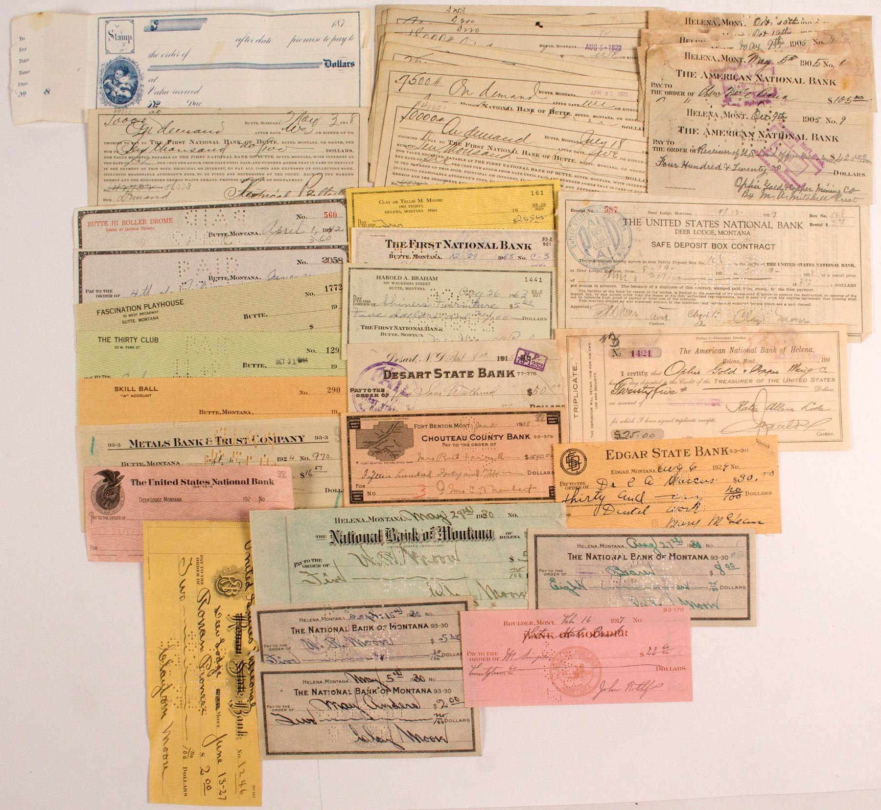 10 The First National Bank of Butte loan receipts c. 1920 with stamps. Approx 25 bank checks from various banks in Montana and ND c. 1905-1963.