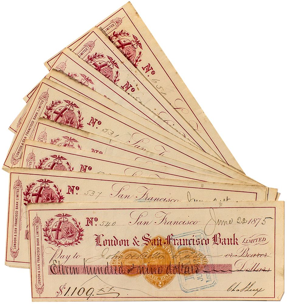 Lot of ten checks all signed by Charles Lux. London & San Francisco Bank. RN-D. Along with Henry Miller, Lux became one of the largest cattle producers in California and largest land owners in America. Cut cancels and light soiling. (Prag Collection)