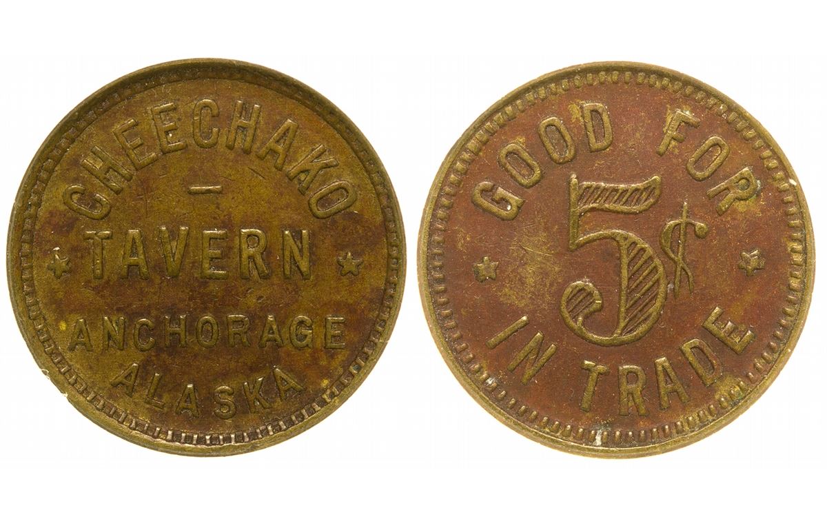 Obv.: Cheechako / Tavern / Anchorage / Alaska; rev.: Good For / 5c / In Trade. NCS genuine.