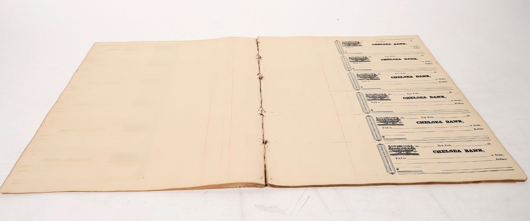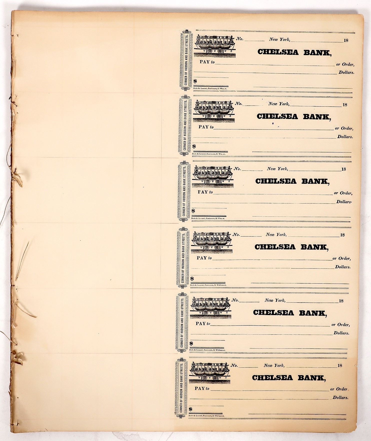A book of checks from the Chelsea Bank of New York, all unissued. The book is 45 pages; each page has 6 checks. Each check has a small vignette of a rail car. The pages are still bound, but the cover is entirely gone; the pages themselves are generally in good condition, with some minor toning/foxing.